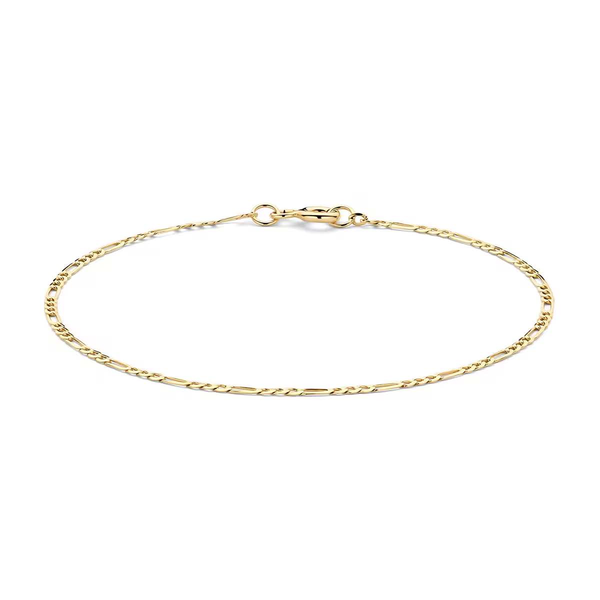 De Blush armband met Figaro schakel in 14 karaat goud is een stijlvolle klassieker die moeiteloos klasse en karakter uitstraalt. Het kenmerkende schakeldesign, bestaande uit afwisselend korte en langere schakels, zorgt voor een speels en tijdloos effect aan de pols.