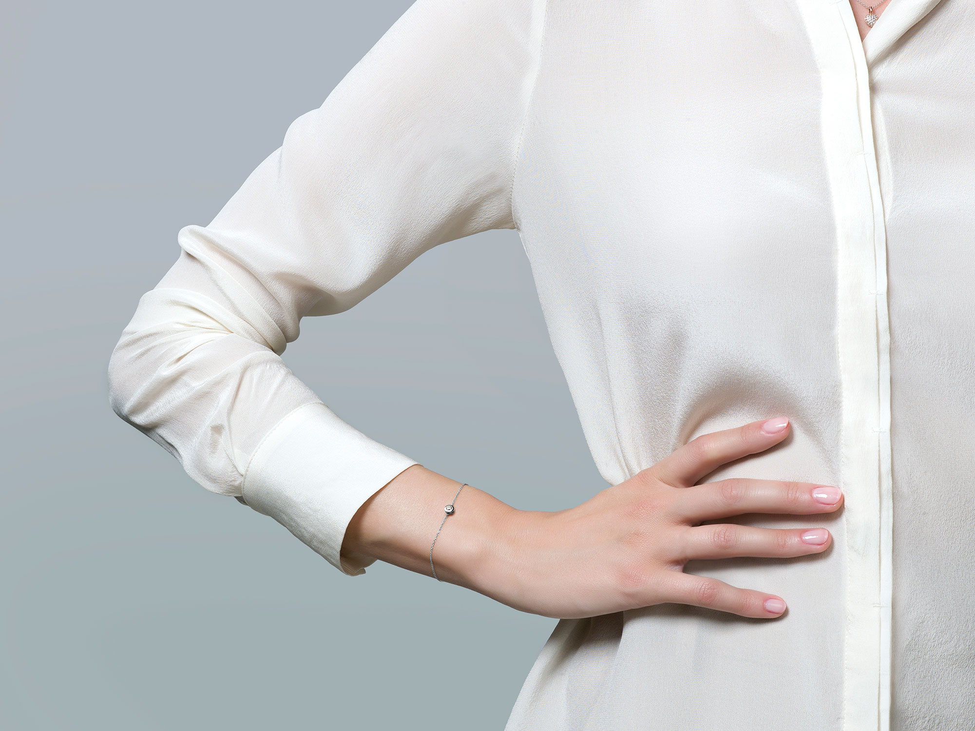 Een verfijnd armbandje van 14-karaats witgoud die een schitterende Zirkonia steen draagt van 2,7 millimeter, in een ronde witgouden zetting met een diameter van 4,9 millimeter. De maximale lengte is 18 centimeter die je op een speelse manier tot elke lengte kunt verstellen dankzij de elegante bolsluiting. Aan het eind van het armbandje hangt een charmant muntje met daarin het Blush logo gegraveerd.