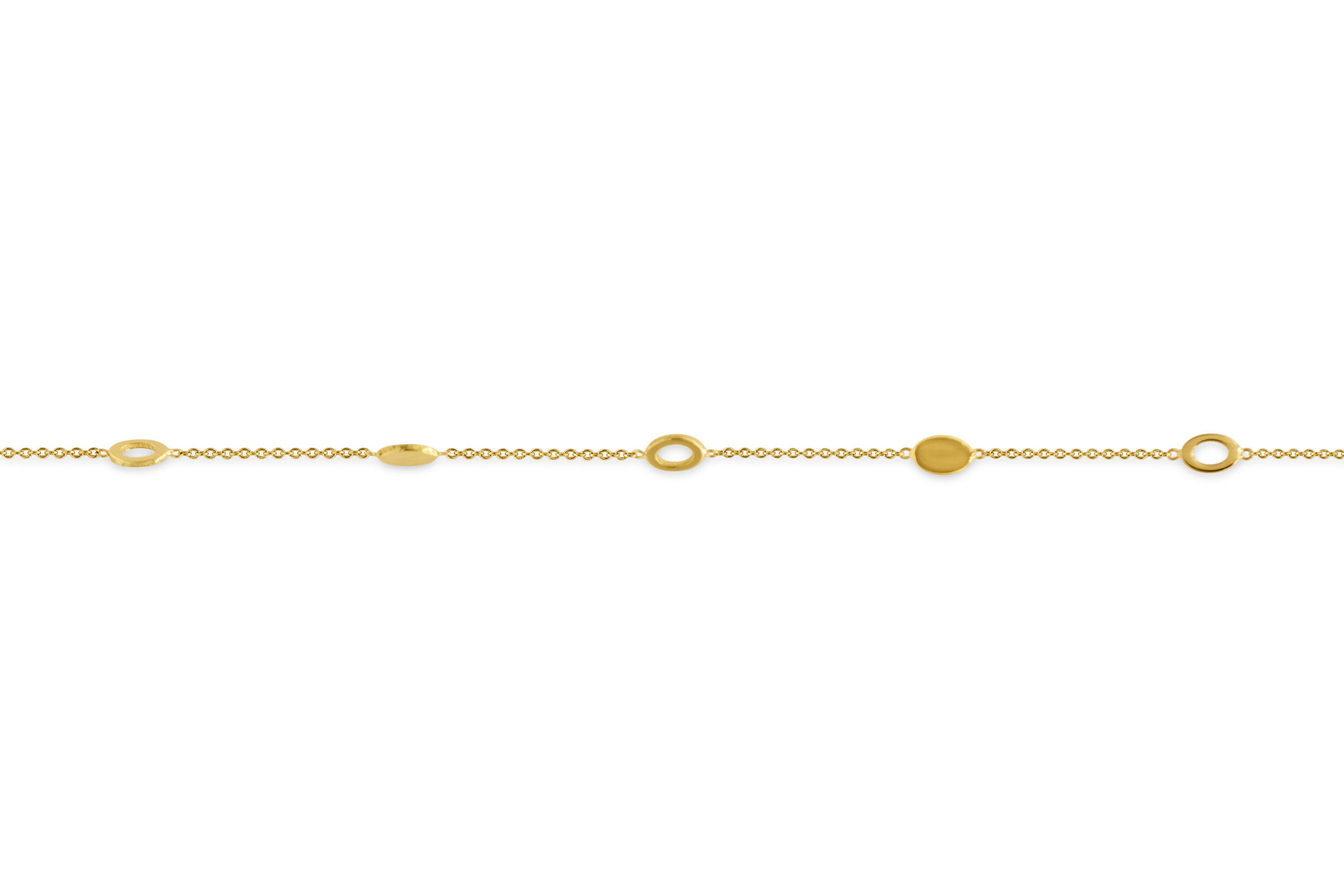 Laat je betoveren door de tijdloze elegantie van deze verfijnde armband, vakkundig vervaardigd uit 18 karaat geelgoud. Het ontwerp kenmerkt zich door een speelse schakeling van glanzende gouden plaatjes, waardoor het sieraad bij elke beweging een subtiel lichtspel creëert.