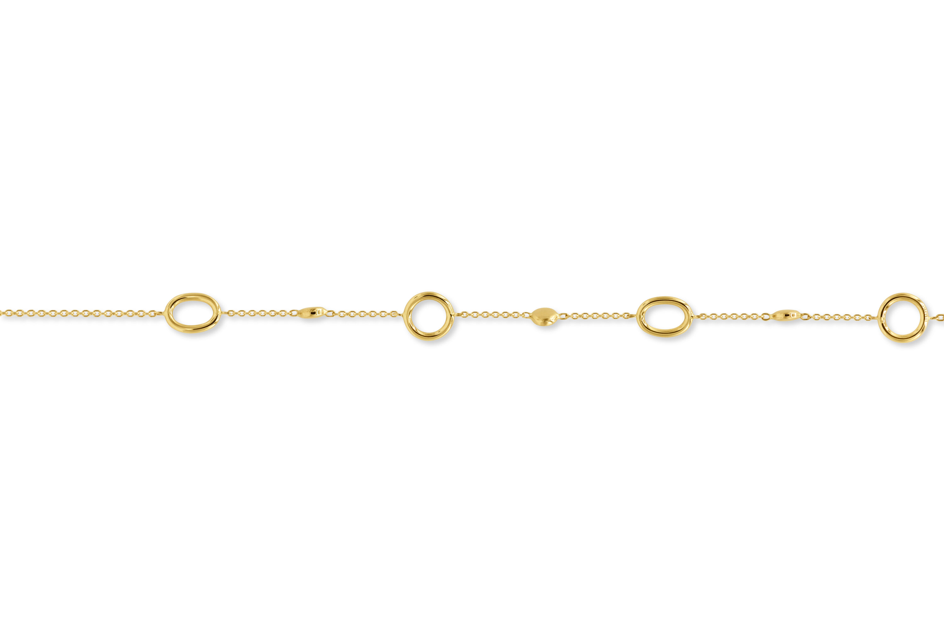Ontdek de moderne elegantie van deze armband, vervaardigd uit 18 karaat geelgoud en afgewerkt met verfijnde open cirkels. Het speelse ontwerp symboliseert verbondenheid en oneindigheid, terwijl het subtiele lijnenspel de armband een lichte en eigentijdse uitstraling geeft.