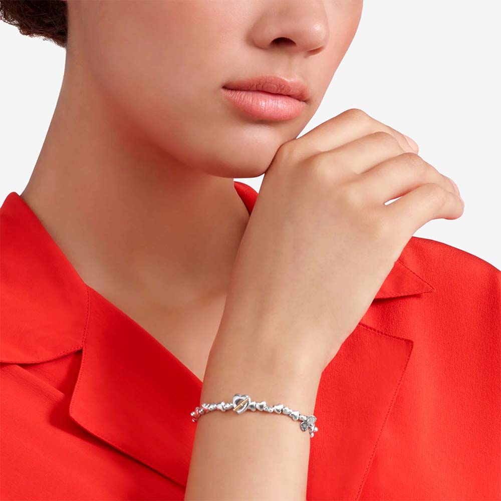 Deze hart armband combineert verfijning en duurzaamheid. De componenten en sluiting cover zijn gemaakt van sterling zilver, terwijl de T-bar in 9kt roosgoud een luxe en warme uitstraling toevoegt. De ketting is vervaardigd uit sterling zilver, wat zorgt voor een tijdloze en elegante look. De sluitring is van staal, wat voor extra stevigheid zorgt.