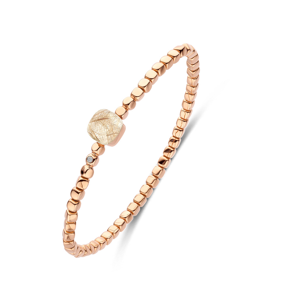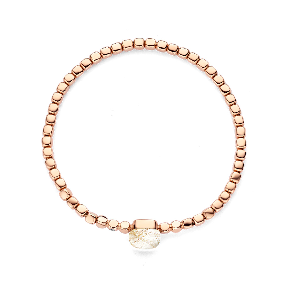 De transparantie van rutielkwarts met zijn karakteristieke naaldstructuren vangt het licht prachtig op, terwijl het witte parelmoer een zachte, elegante glans toevoegt. Dankzij het stretch ontwerp sluit de armband perfect aan rond elke pols en is hij heel comfortabel om te dragen.