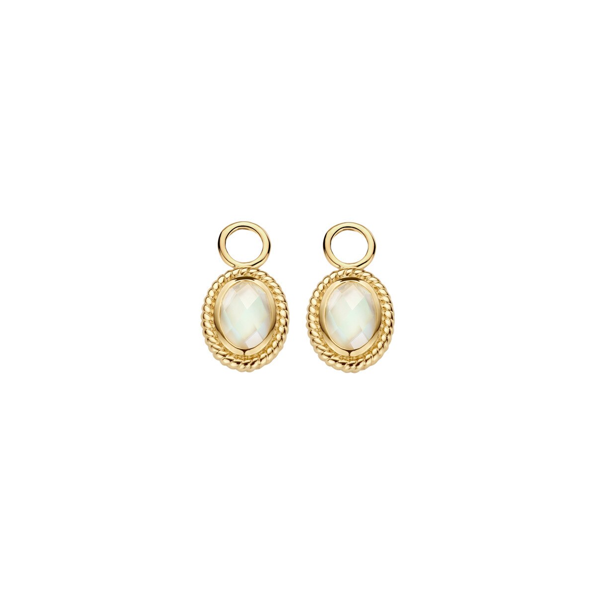 Deze oorbedels van 14k geelgoud met parelmoer en bergkristal omringd door een koordmotief stralen van alle kanten elegantie uit. De bedels zijn 11,5 mm hoog en 6,3 mm breed. Stijlvol op zichzelf of in combinatie met andere sieraden uit onze collectie.