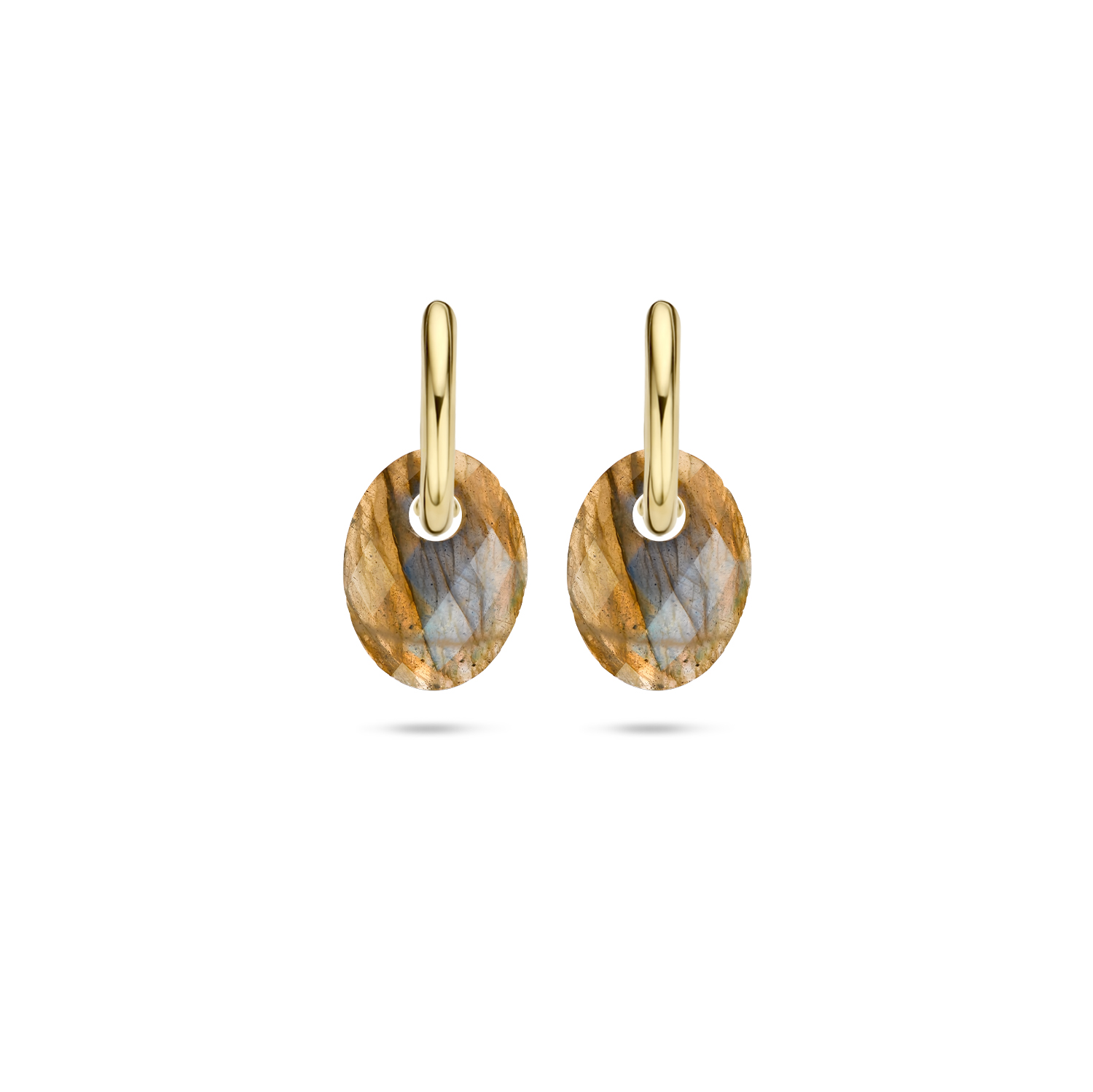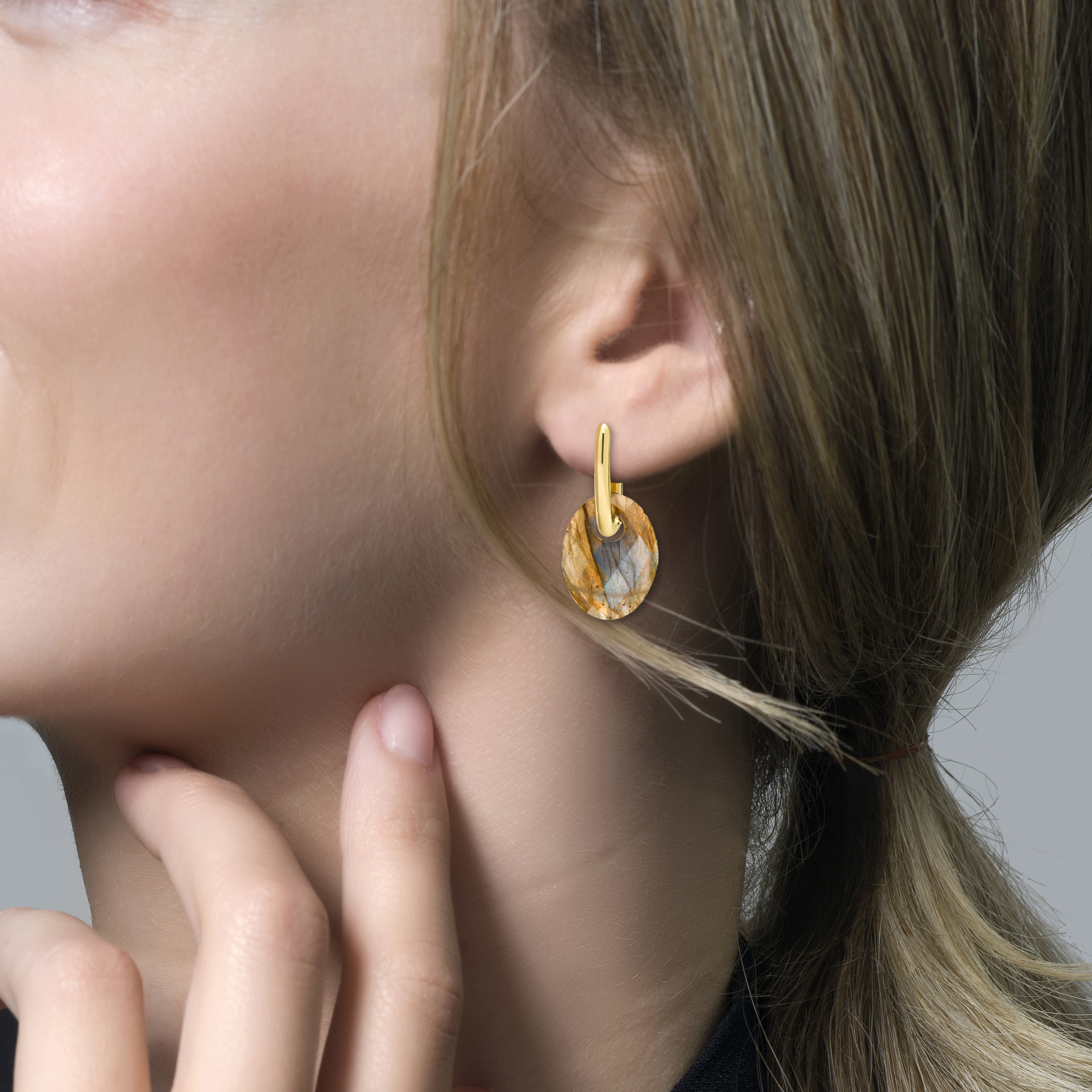 Hou je van speels en stylish? Dan zijn deze natuurstenen oorbedels iets voor jou. De ovaalvormige bedels zijn gemaakt van labradoriet met facetslijpsel. Ze zijn 20 mm hoog en passen om oorringen met maximaal 3 mm doorsnede. Prachtig samen met gouden oorbedels van Blush.