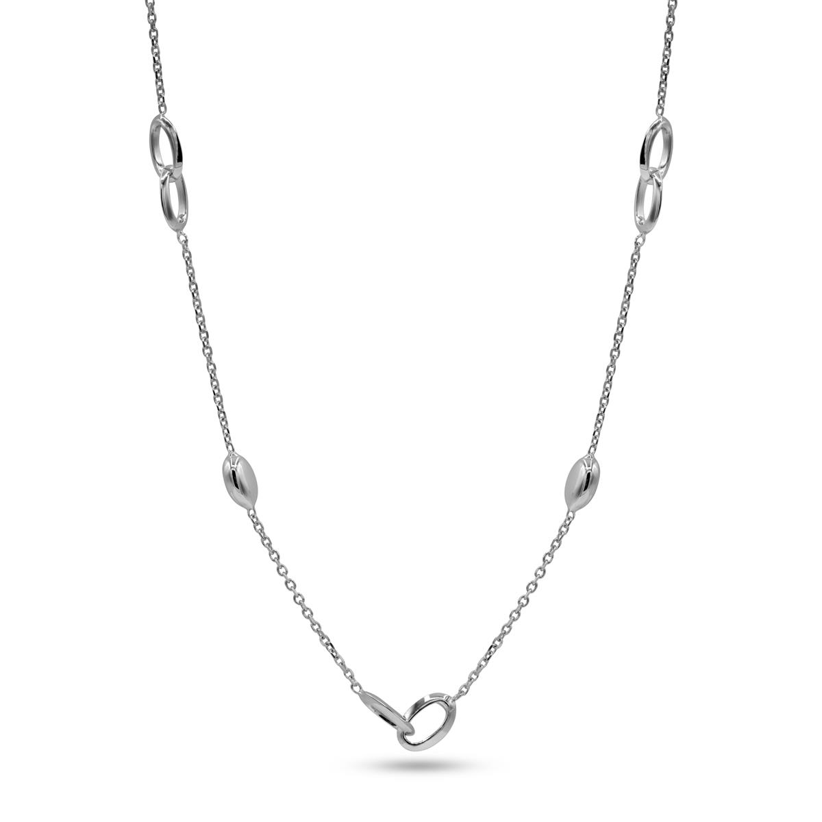 Elegante ketting in 18 kt witgoud, uitgevoerd met een stijlvol afwisselend patroon van schakels en gouden plaatjes. Het verfijnde ontwerp geeft deze ketting een moderne en tijdloze uitstraling, waardoor hij zowel dagelijks als bij speciale gelegenheden prachtig te dragen is. Een luxueus sieraad dat klasse en subtiliteit perfect samenbrengt.