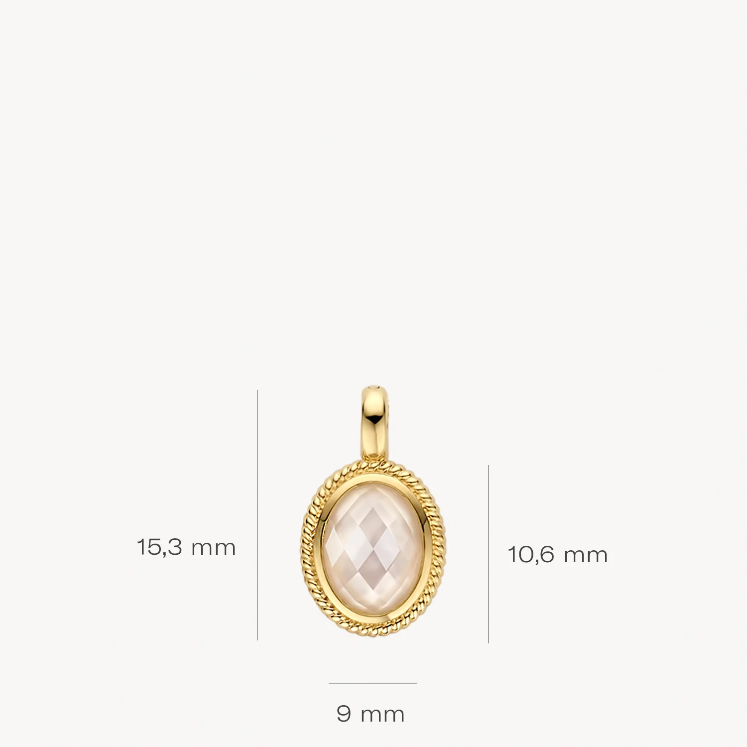 Deze Blush hanger van 14 karaat geelgoud is een subtiel sieraad dat elegantie en verfijning uitstraalt. De combinatie van parelmoer en bergkristal zorgt voor een zachte, glanzende diepte. Het iriserende parelmoer vangt het licht in zachte tinten, terwijl het heldere bergkristal als een beschermende laag de natuurlijke schoonheid versterkt en extra glans toevoegt.