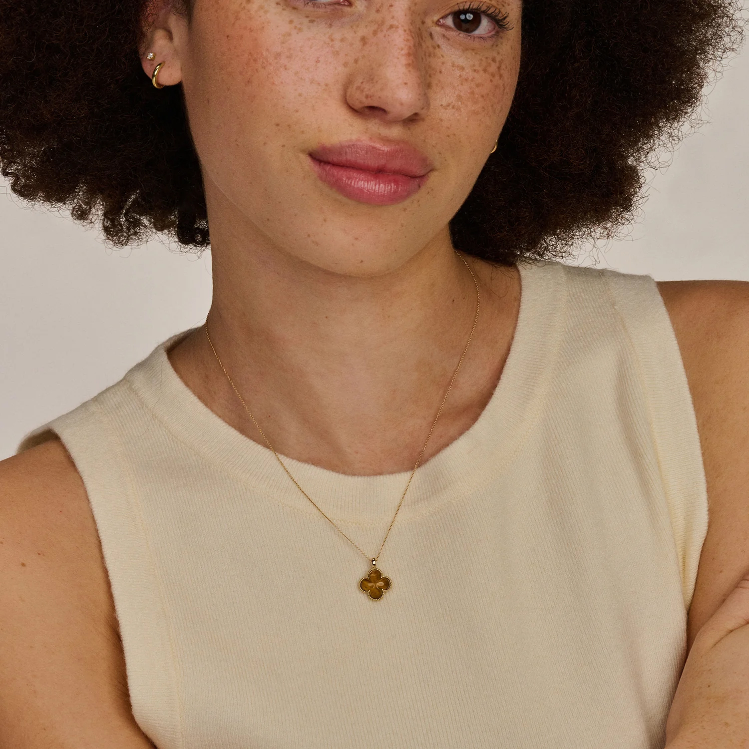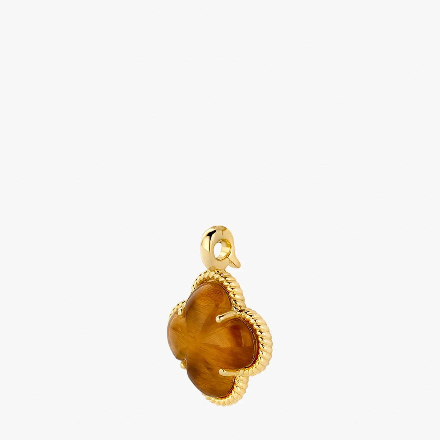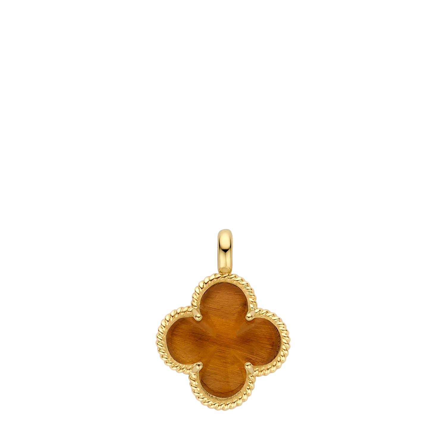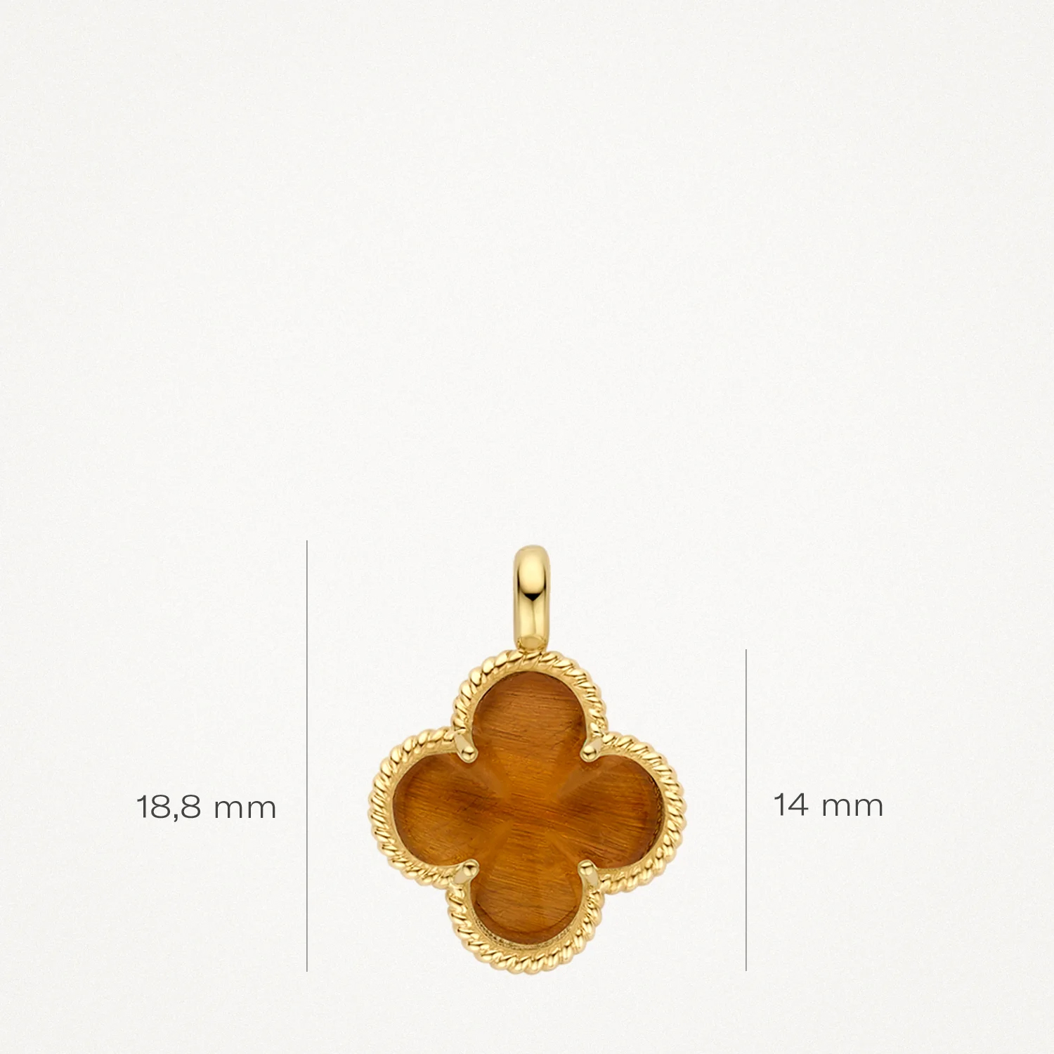 Deze Blush hanger van 14 karaat geelgoud straalt natuurlijke kracht en verfijning uit. In het midden schittert een tijgeroog, bekend om zijn warme bruin-goudkleurige glans en beschermende energie. De steen wordt bedekt met een heldere bergkristal, wat zorgt voor extra diepte, glans en een subtiel lichtspel bij elke beweging.