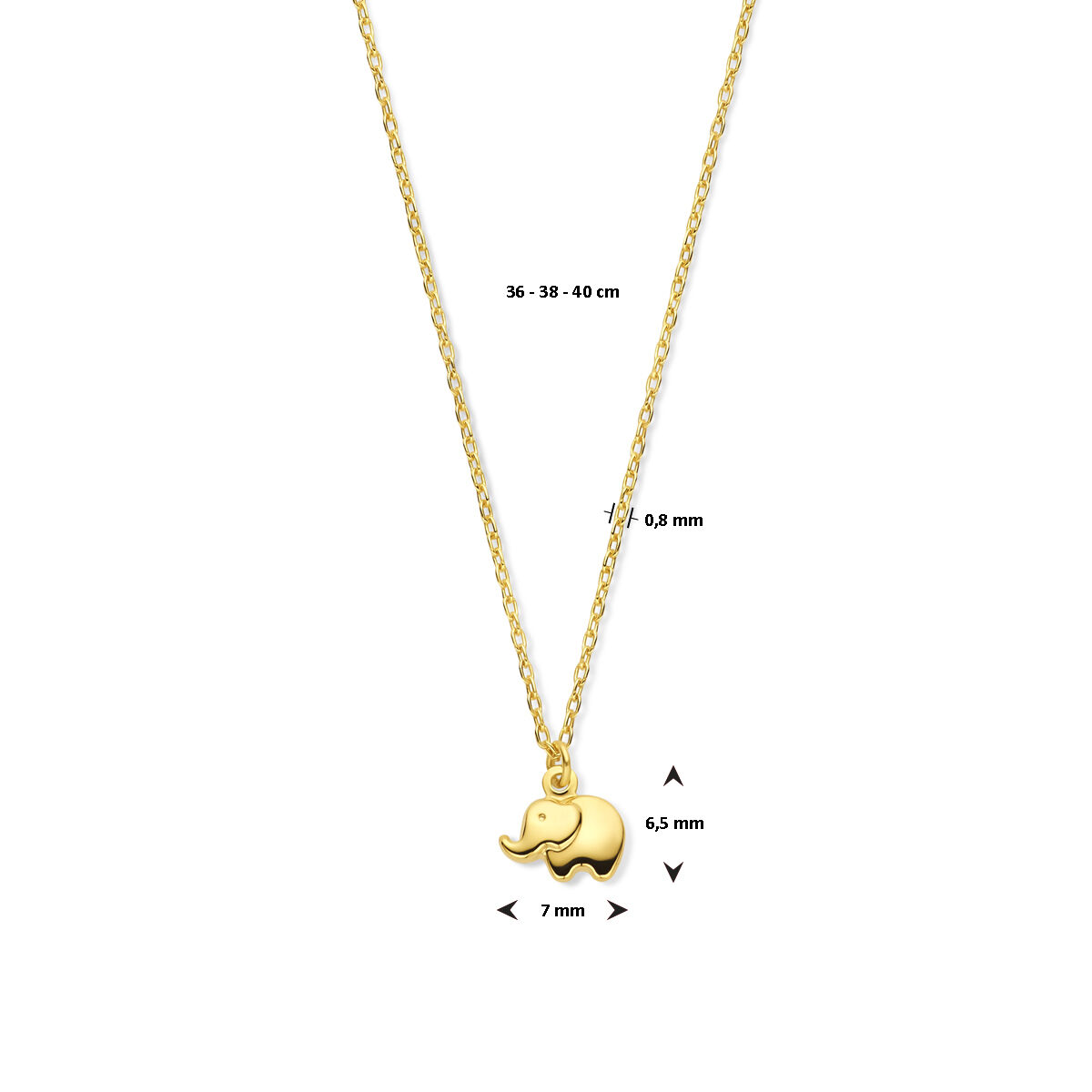 14k Geelgouden collier uitgevoerd met een olifant. Het collier heeft een draaglengte van 36cm met 2 + 2cm extensies. Uitgevoerd met een veerring.