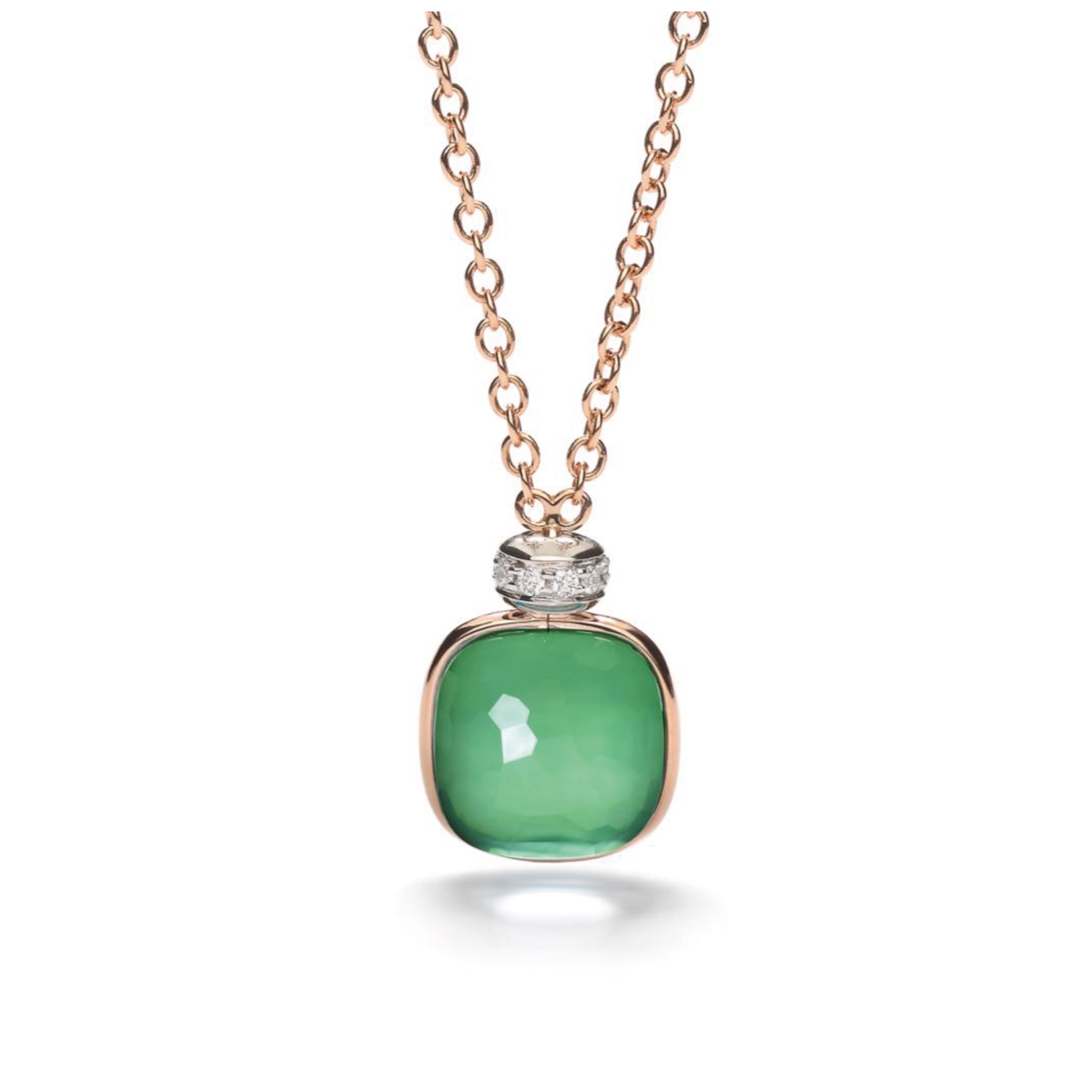 Deze verfijnde halsketting combineert 18kt roosgoud en witgoud in een elegant ontwerp. De hanger wordt gesierd door een indrukwekkende Prasiolite in combinatie met Agaat (12,4ct), met zijn diepe, rijke groene kleur die onmiddellijk de aandacht trekt.