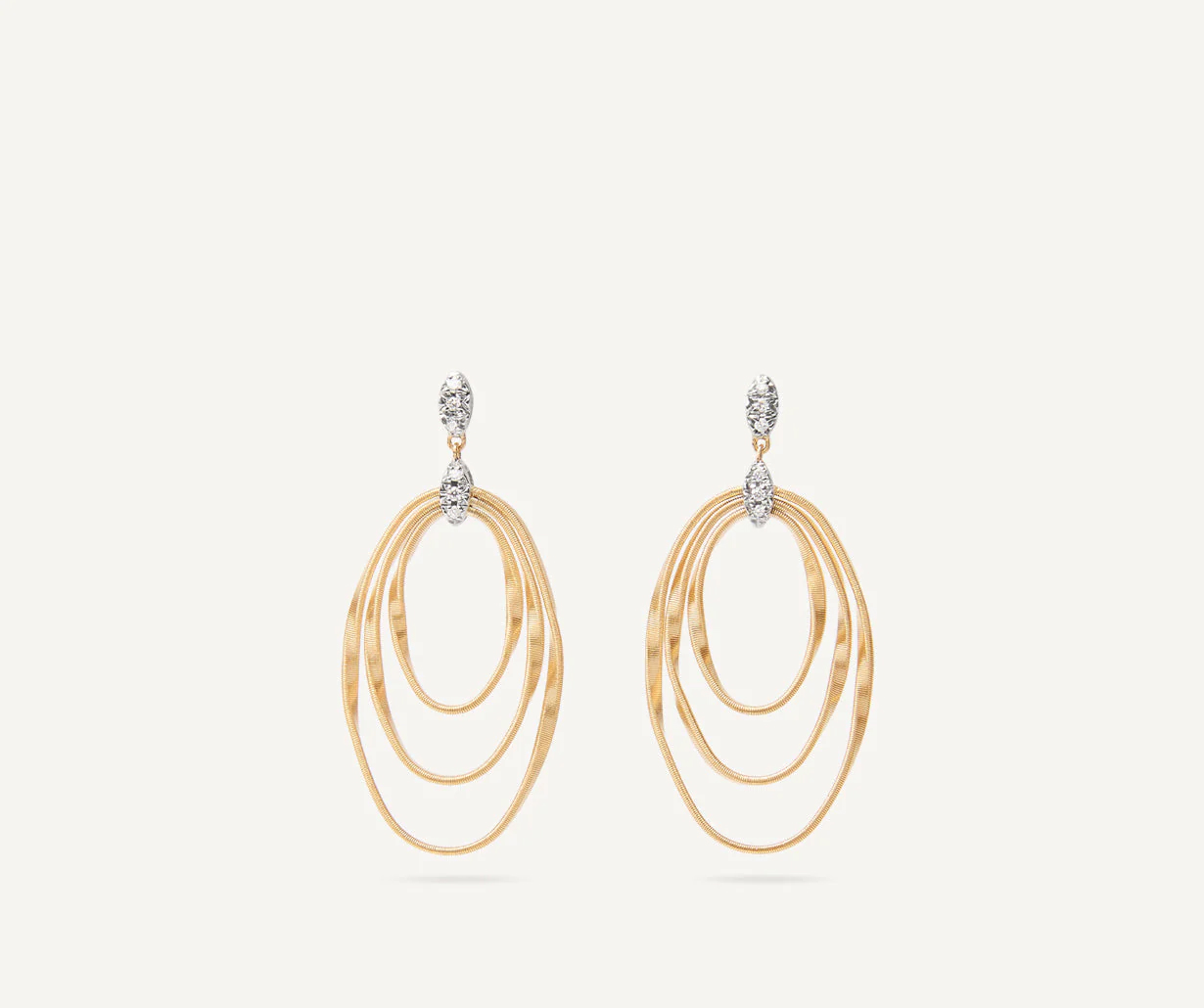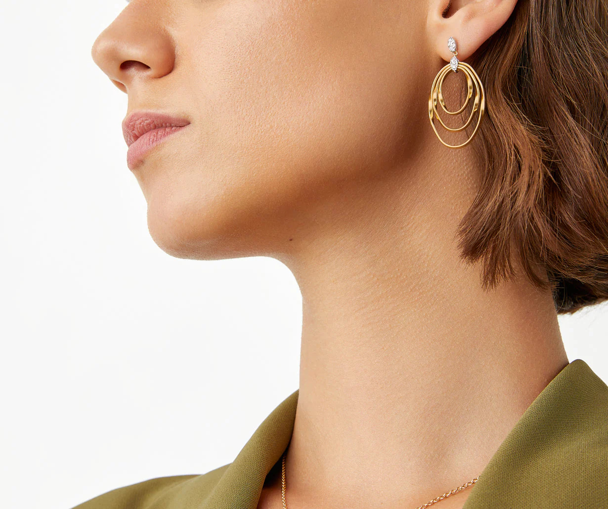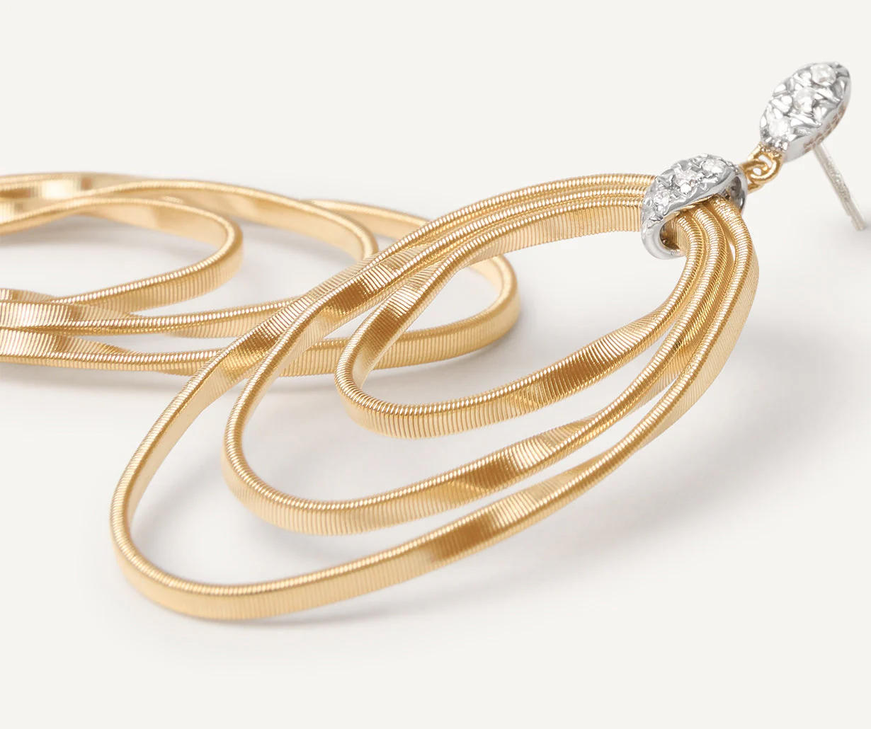 Uitgevoerd in geelgoud en verfijnd afgewerkt met briljantgeslepen diamanten, stralen deze oorbellen een warme, luxueuze schittering uit. Het golvende design, geïnspireerd op traditionele ambacht en moderne elegantie, creëert een speels lijnenspel met een uitgesproken vrouwelijke uitstraling.