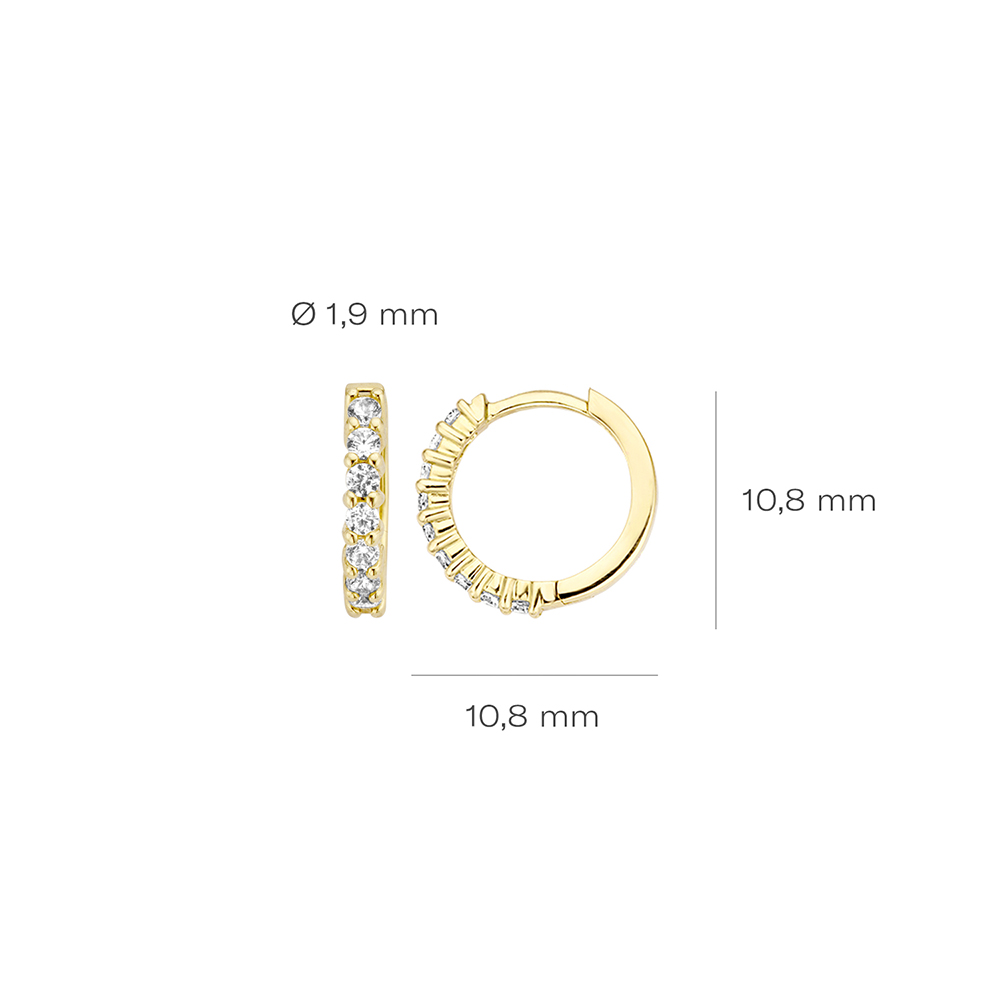 Deze elegante oorringen in 14kt geelgoud zijn voorzien van schitterende witte zirconia die voor een verfijnde glans zorgen. Met een ronde vorm, een dikte van 1,9 mm en een hoogte van 12,5 mm, zijn ze subtiel en stijlvol tegelijk.