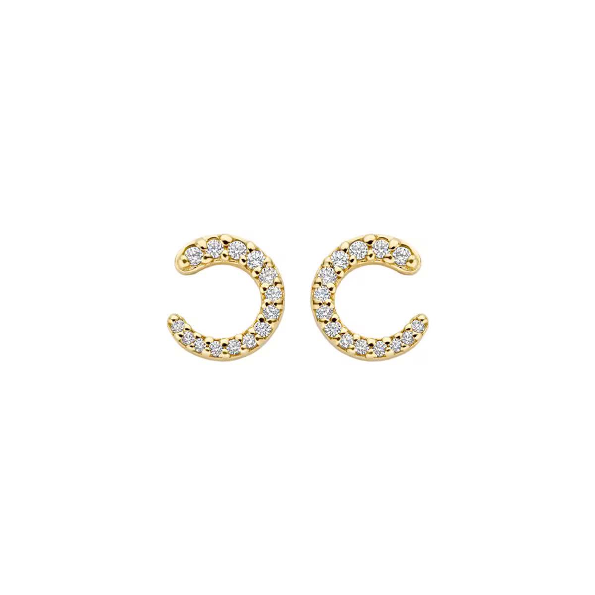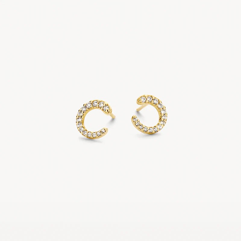 Deze oorbellen in 14 karaat geelgoud met pavé gezette zirkonia in een halve cirkel vormen de perfecte balans tussen moderne elegantie en tijdloze klasse. Het warme geelgoud geeft een luxe uitstraling, terwijl de fijn gezette zirkonia’s zorgen voor een schitterende fonkeling bij elke beweging.