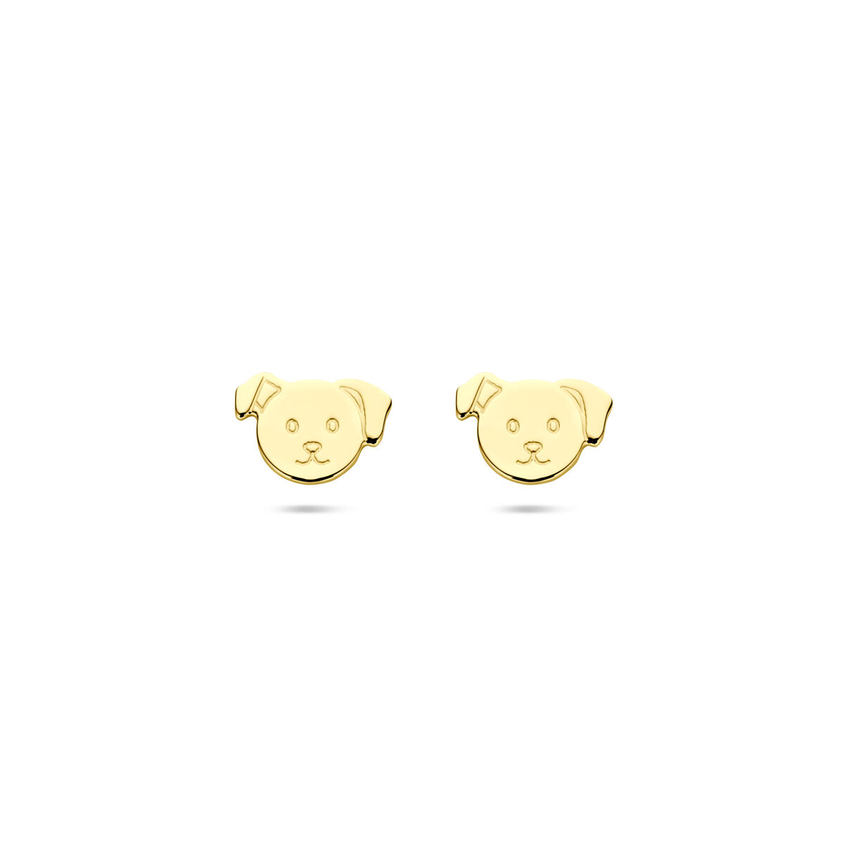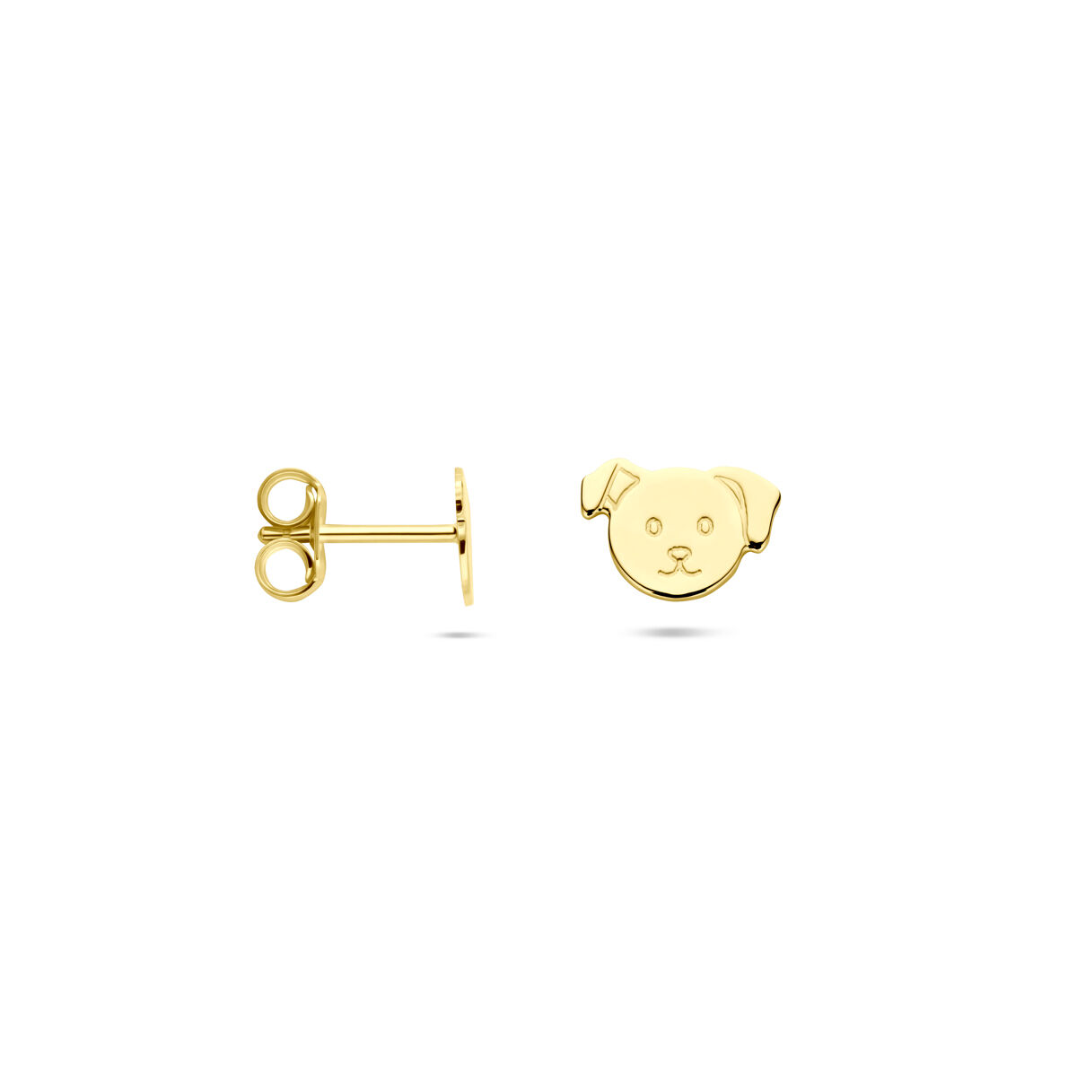14k Geelgouden oorknoppen uitgevoerd met een hond. De oorknoppen hebben een afmeting van 6x8.5mm.