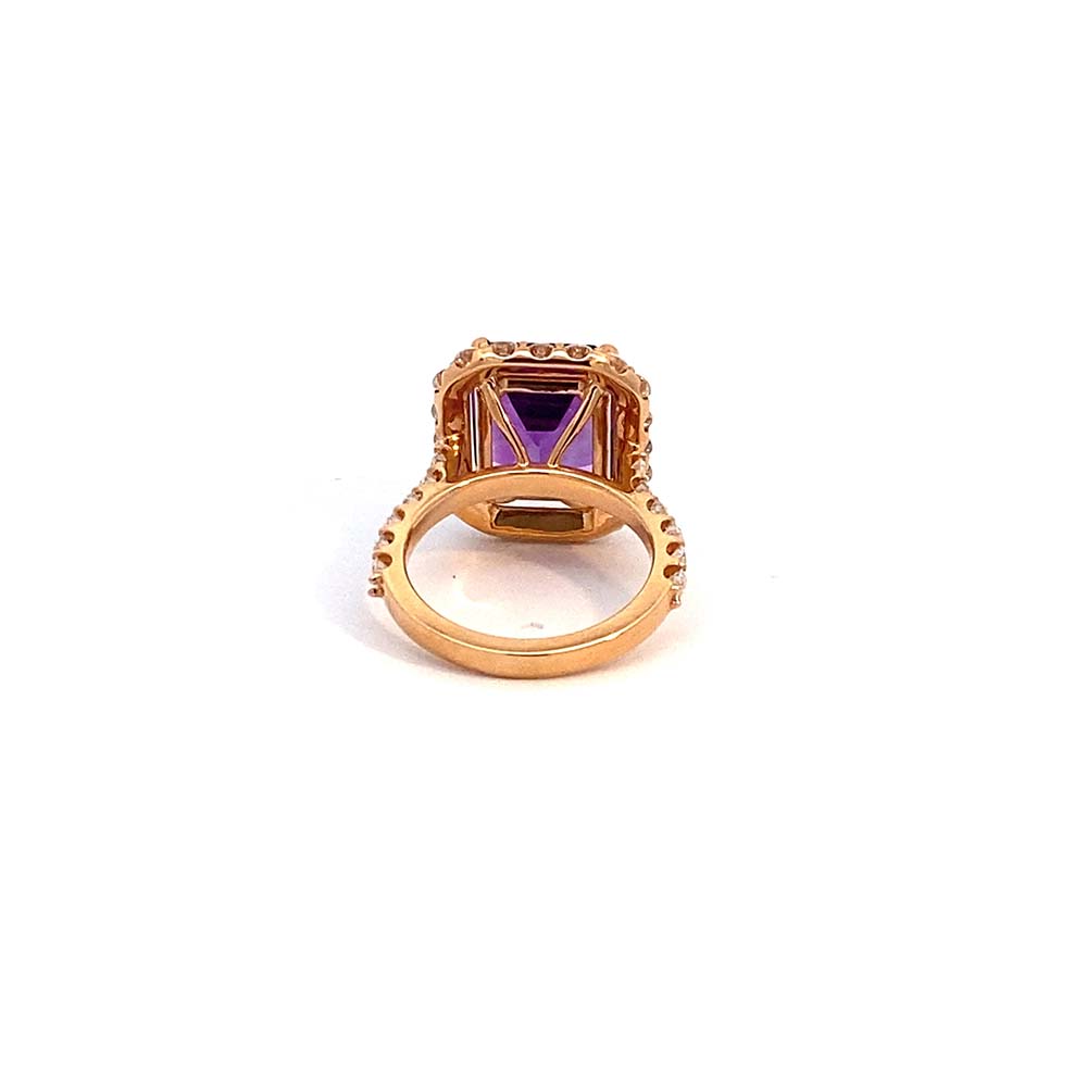 Deze prachtige ring, vervaardigd uit 18kt roosgoud, is zowel stijlvol als elegant met een vleugje kleurrijke verfijning. De ring beschikt over een centraal geplaatste, dieppaarse amethist, die bekendstaat om zijn koninklijke uitstraling en rustgevende energie. Omringd door schitterende briljant geslepen diamanten, straalt dit sieraad luxe en verfijning uit. Het warme roségoud complimenteert de rijke tinten van de amethist en de helderheid van de diamanten, waardoor een harmonieuze en oogverblindende samenstelling ontstaat. Dit sieraad is perfect voor bijzondere gelegenheden en een prachtig geschenk voor iemand die houdt van een combinatie van klassieke en moderne elegantie.