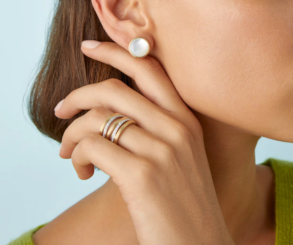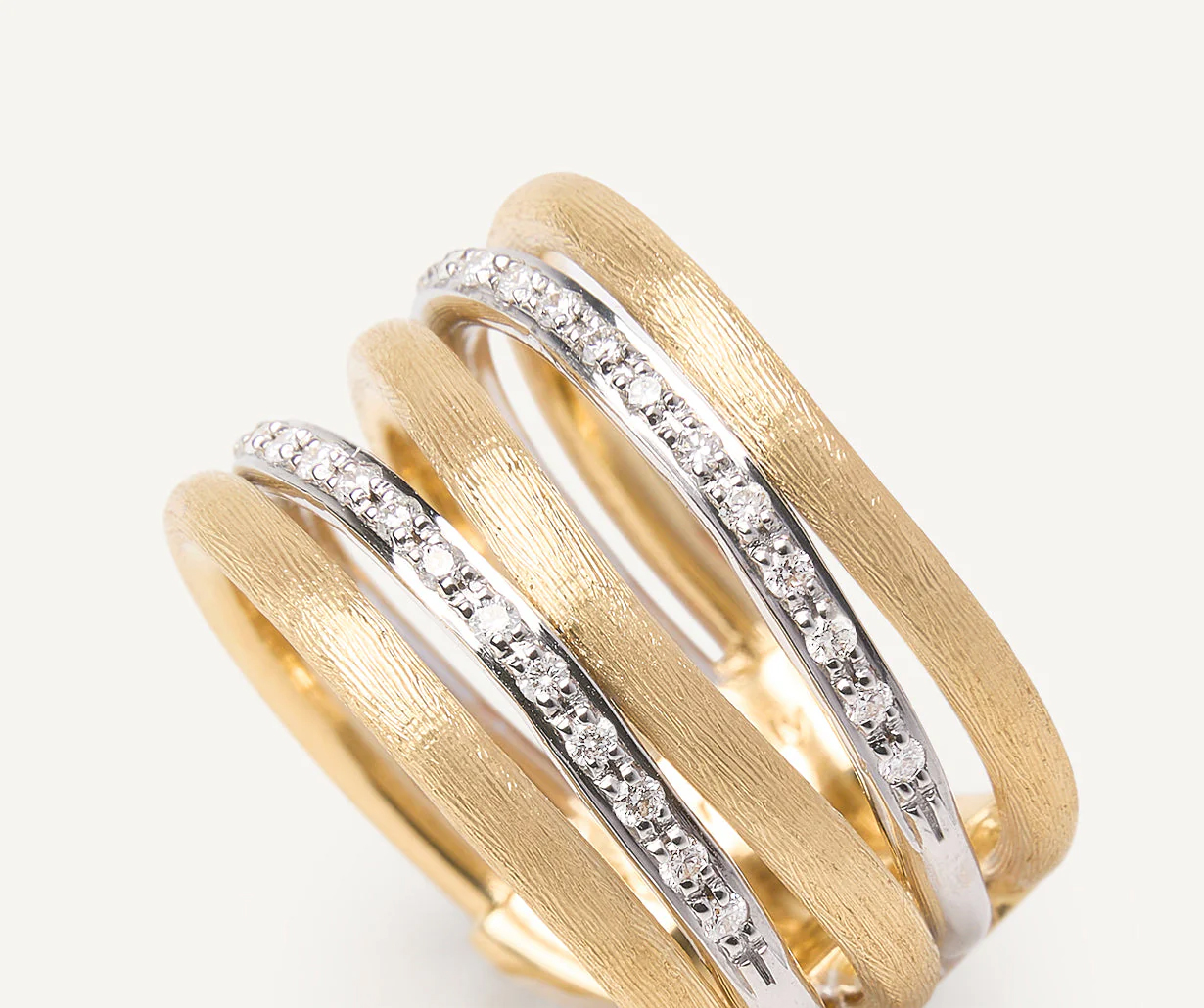 Fijn gezette briljantgeslepen diamanten zorgen voor een subtiele, maar luxueuze schittering die het licht vanuit elke hoek vangt. Het gelaagde design geeft de ring een moderne uitstraling, terwijl de warme goudtint en tijdloze afwerking zorgen voor een blijvende elegantie.