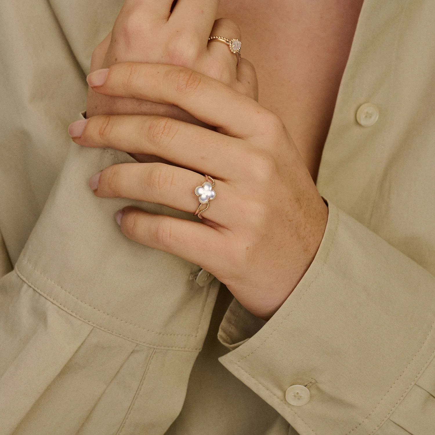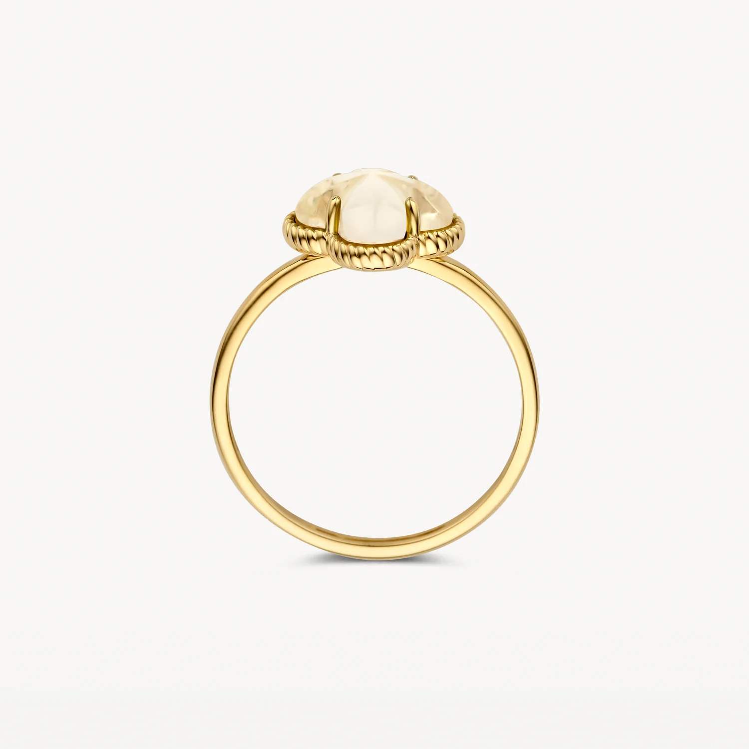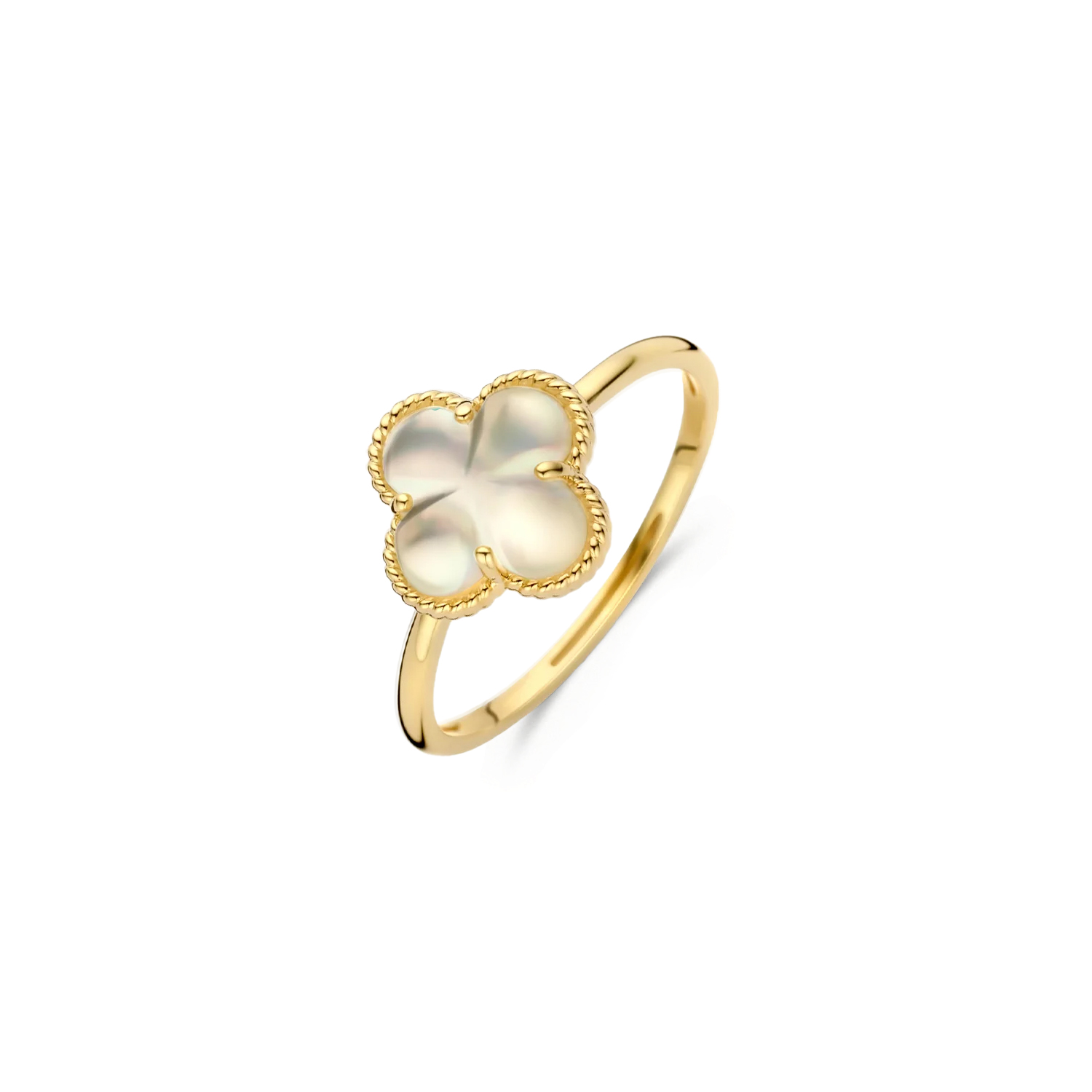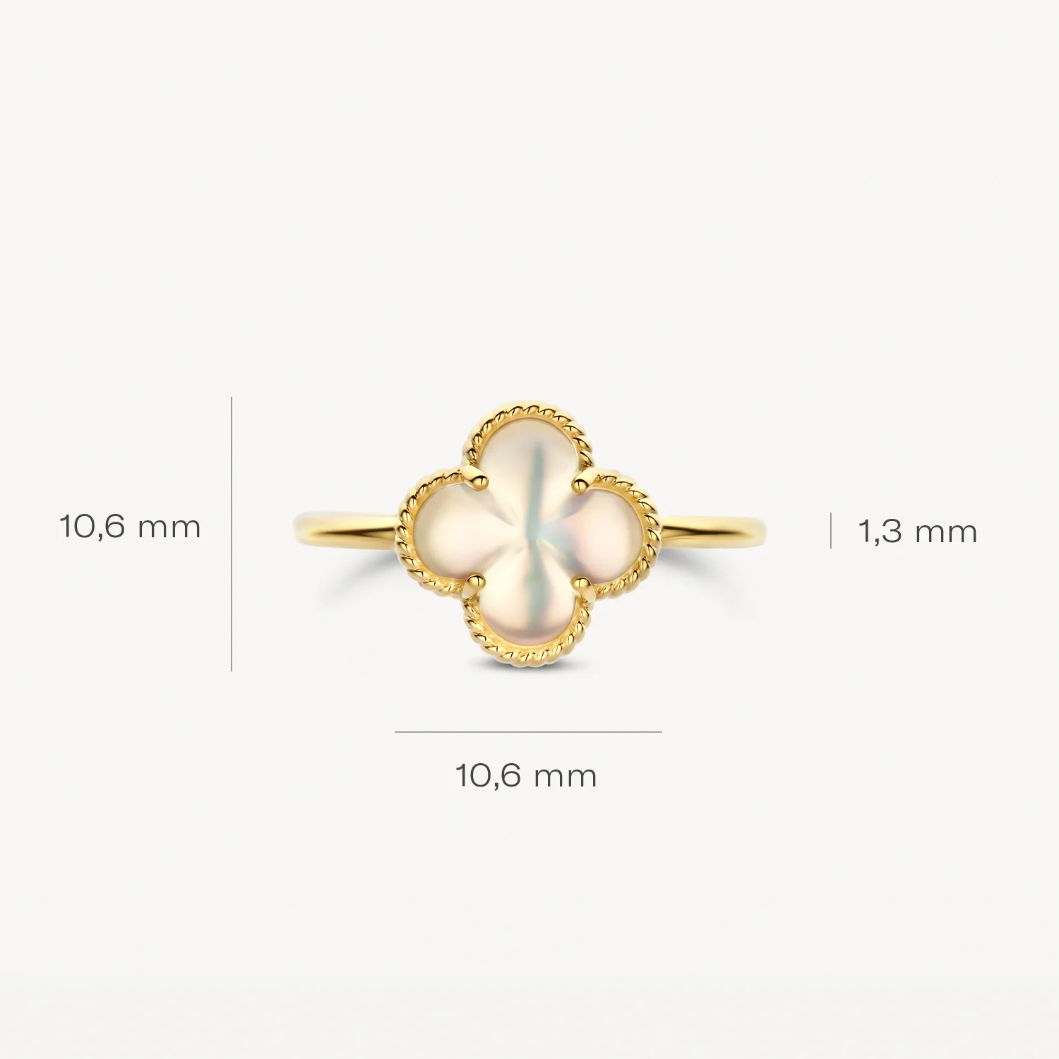 De witte kleur  staat symbool voor balans en harmonie, terwijl het fijne goud een subtiele, vrouwelijke uitstraling geeft. Of je deze ring nu solo draagt voor een minimalistische look, of combineert met andere sieraden voor een speels effect – dit stuk voegt gegarandeerd klasse toe aan elke outfit.