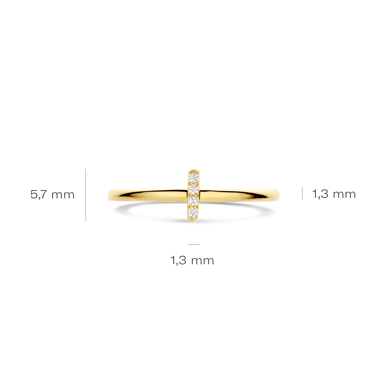 Deze ring in 14kt geelgoud valt op door het minimalistische design. Zirconia's schitteren in een staafje dat haaks op de band staat.