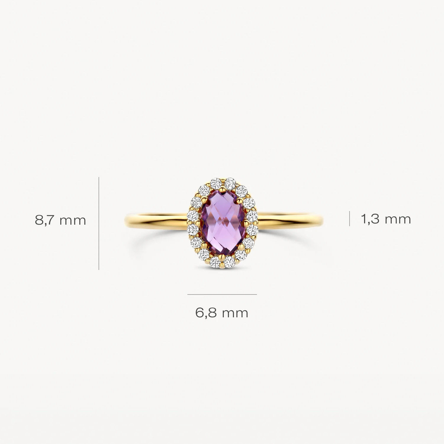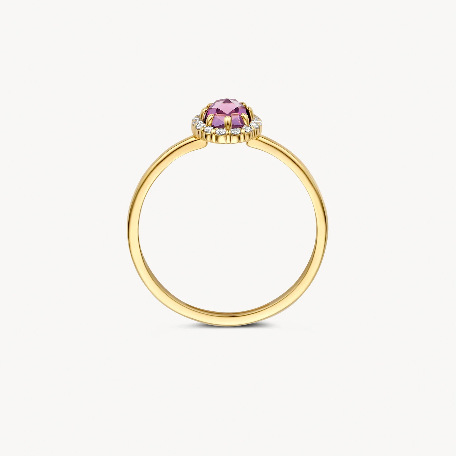 Deze elegante ring van Blush straalt tijdloze klasse uit. Vervaardigd uit 14 karaat geelgoud is de ring verfijnd en duurzaam – perfect voor dagelijks gebruik én bijzondere gelegenheden. Het pronkstuk is een schitterende amethist, zorgvuldig gezet in een klassieke solitaire stijl. De paarse tint van de edelsteen vormt een prachtig contrast met het warme geelgoud en geeft de ring een luxe uitstraling.