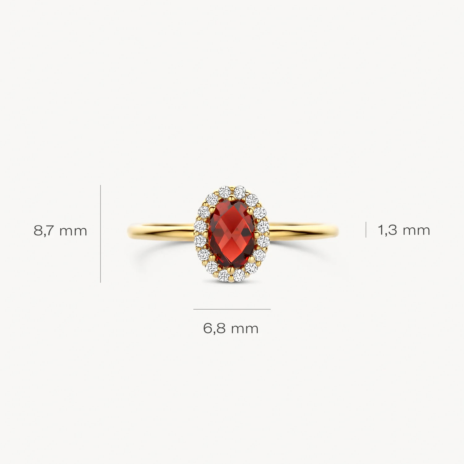 Deze Blush ring van 14 karaat geelgoud is een ode aan vrouwelijke kracht en elegantie. In het hart schittert een intens rode granaat, een edelsteen die bekendstaat om haar diepe kleur en symboliek van passie, liefde en energie. De rijke, robijnachtige tint contrasteert prachtig met het warme goud en geeft de ring een klassieke, maar toch eigentijdse uitstraling.