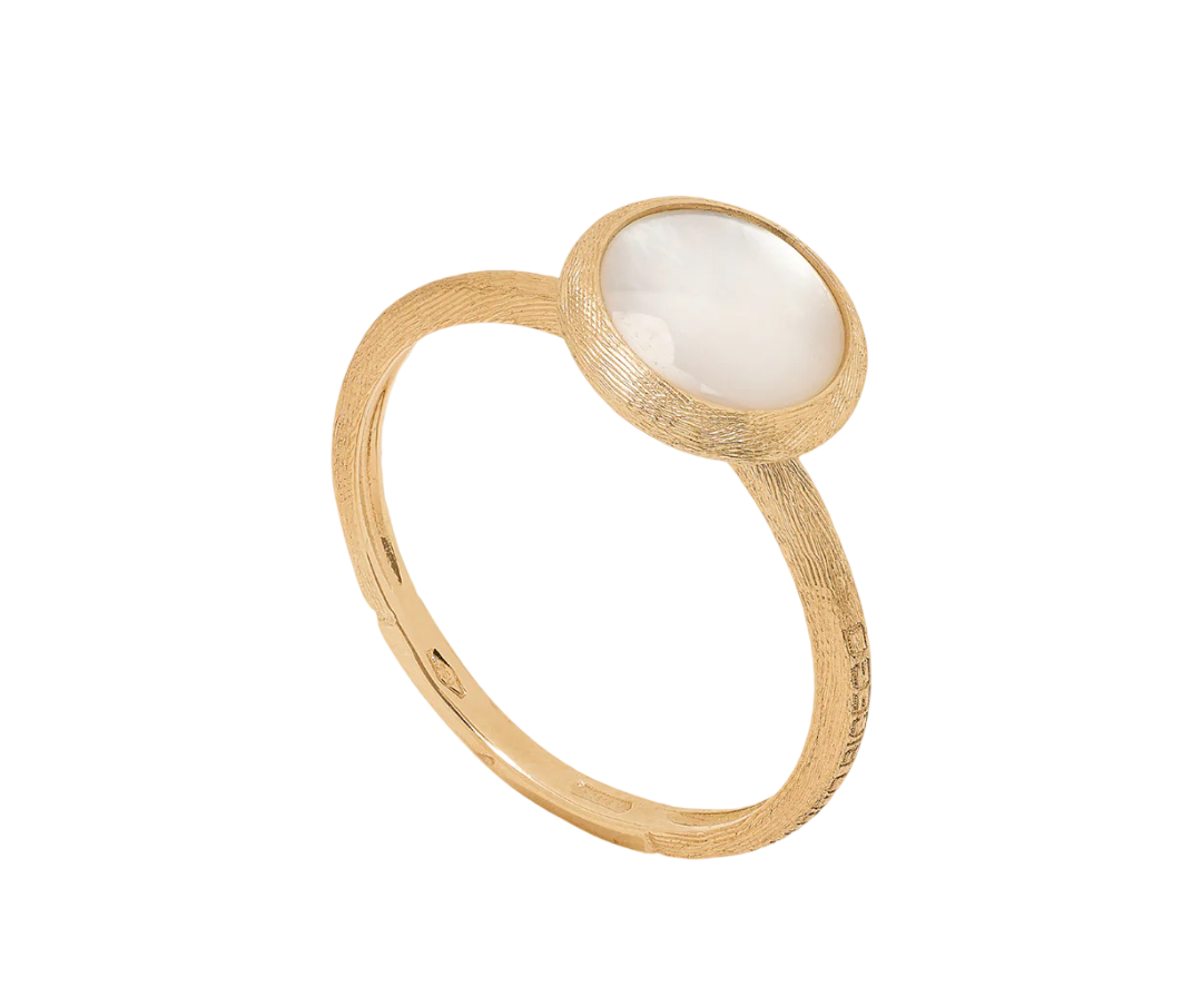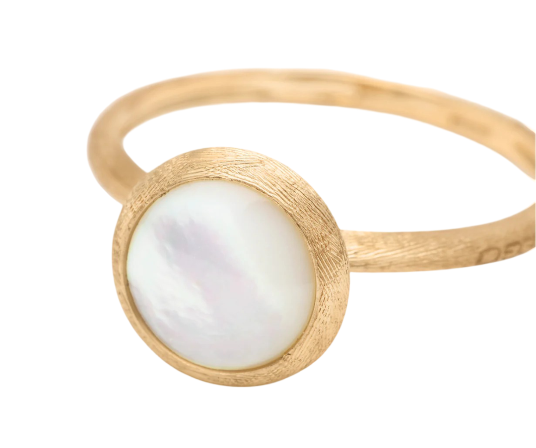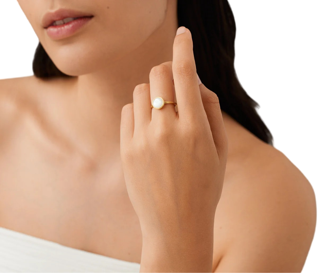 De collectie, geïnspireerd door de legendarische stad Jaipur, draait rond de edelstenen. De gouden, handgegraveerde frames zijn bedoeld om de kleuren te omarmen. Deze ring is vervaardigd in 18 kt goud en bevat een maansteen edelsteen.
