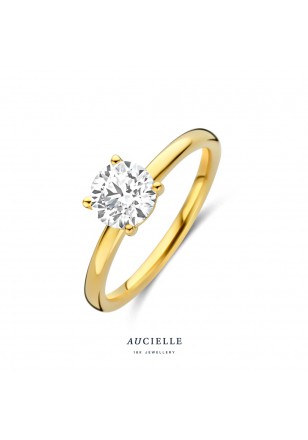Deze exclusieve Aucielle ring is vervaardigd uit 18 karaat geelgoud en gezet met een indrukwekkende solitaire diamant van 1 karaat. De diamant wordt sierlijk vastgehouden door vier griffen, wat zorgt voor een klassieke en elegante uitstraling. Het tijdloze ontwerp en het hoogwaardige vakmanschap maken deze ring tot een perfecte keuze voor speciale gelegenheden, zoals een verloving of jubileum.