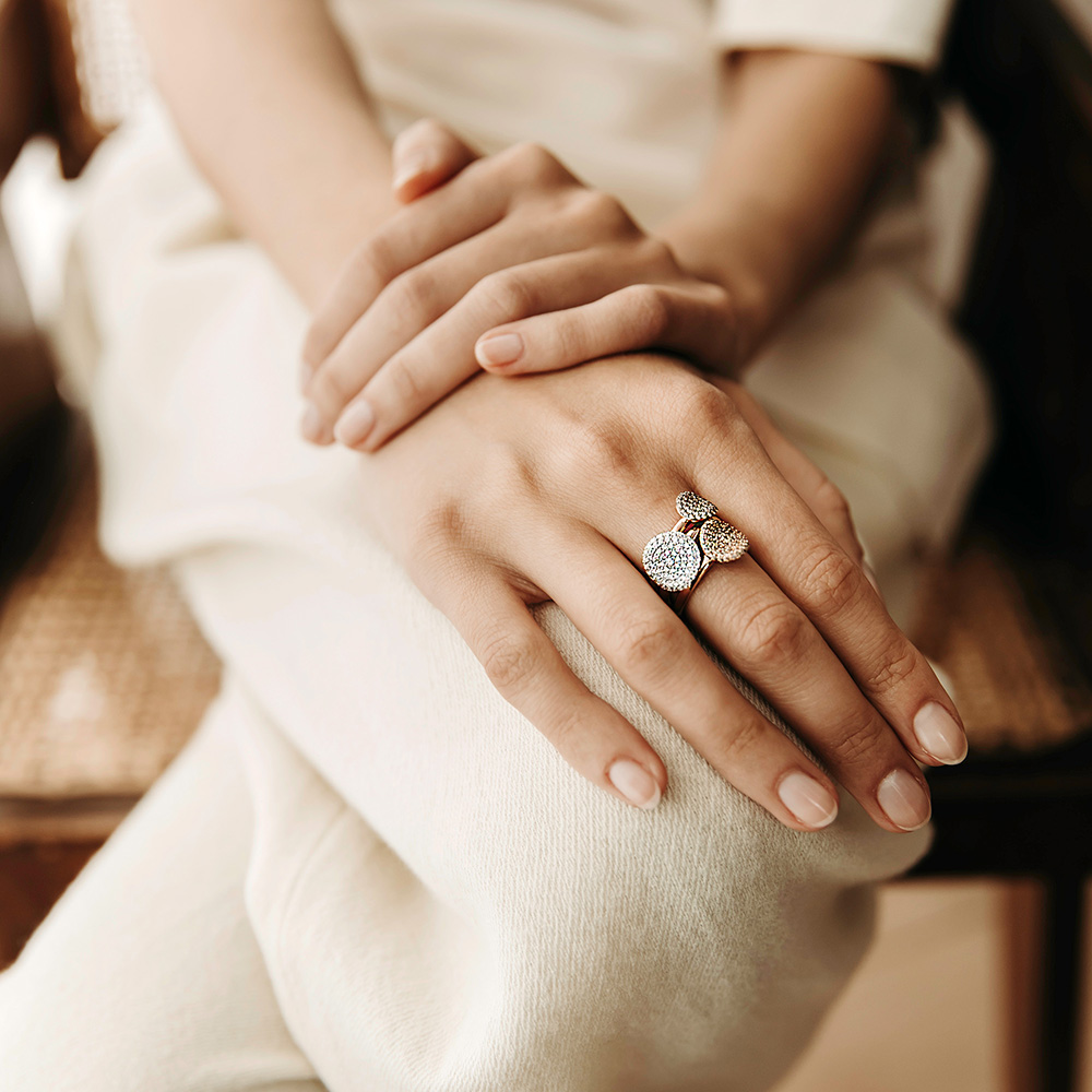 De warme gloed van het roségoud vormt een verfijnd contrast met de sprankelende witte diamanten, zorgvuldig gezet om een maximale schittering te creëren. Met haar subtiele, afgeronde vormen is de Mini Waves ring uiterst comfortabel om te dragen en ideaal voor wie houdt van luxueuze eenvoud met een artistieke toets.