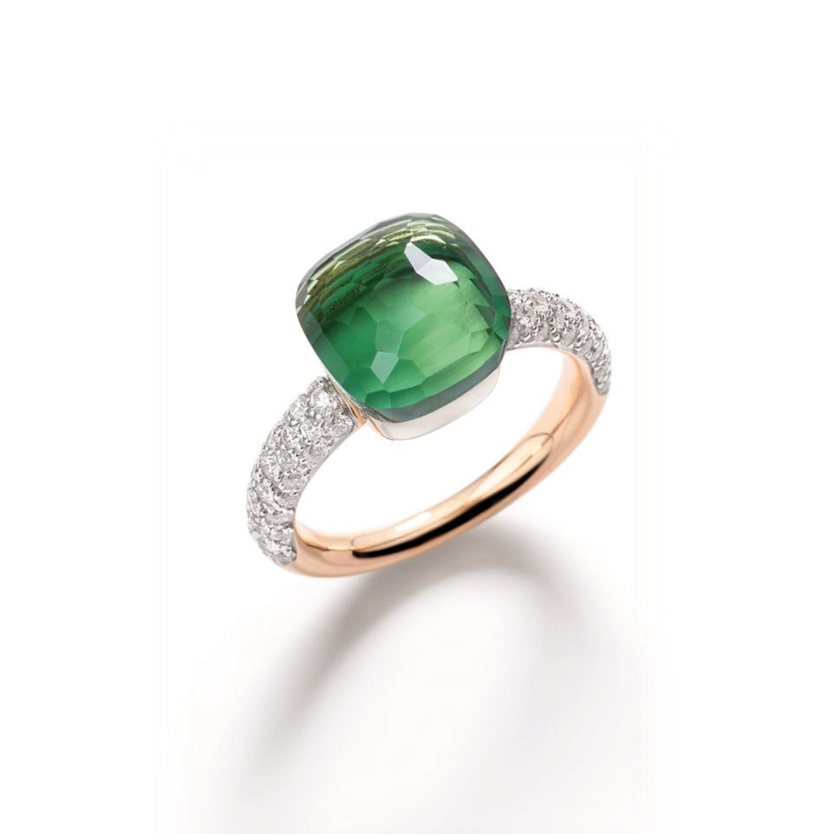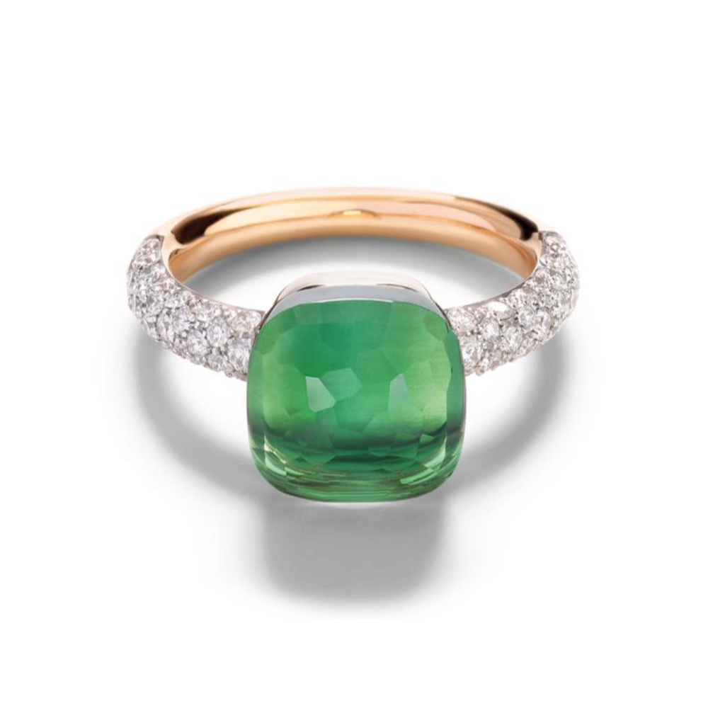 Deze prachtige Nudo ring is vervaardigd in 18kt roos- en witgoud, gezet met een indrukwekkende groene prasiolite van 9 ct en 58 sprankelende witte briljanten (0,70 ct) op wit gerhodineerd roségoud. De Nudo-collectie viert de unieke kracht en expressie van elke vrouw. Met zijn herkenbare, 'naakte' edelsteen zonder prong-setting en de veelzijdige stapelbaarheid in een spectrum van kleuren, biedt Nudo een uniek middel om de eigen stijl en persoonlijkheid uit te drukken. De Nudo-vrouw is vrij om zichzelf te zijn: opvallend, sterk, ongebruikelijk en vol kleur.