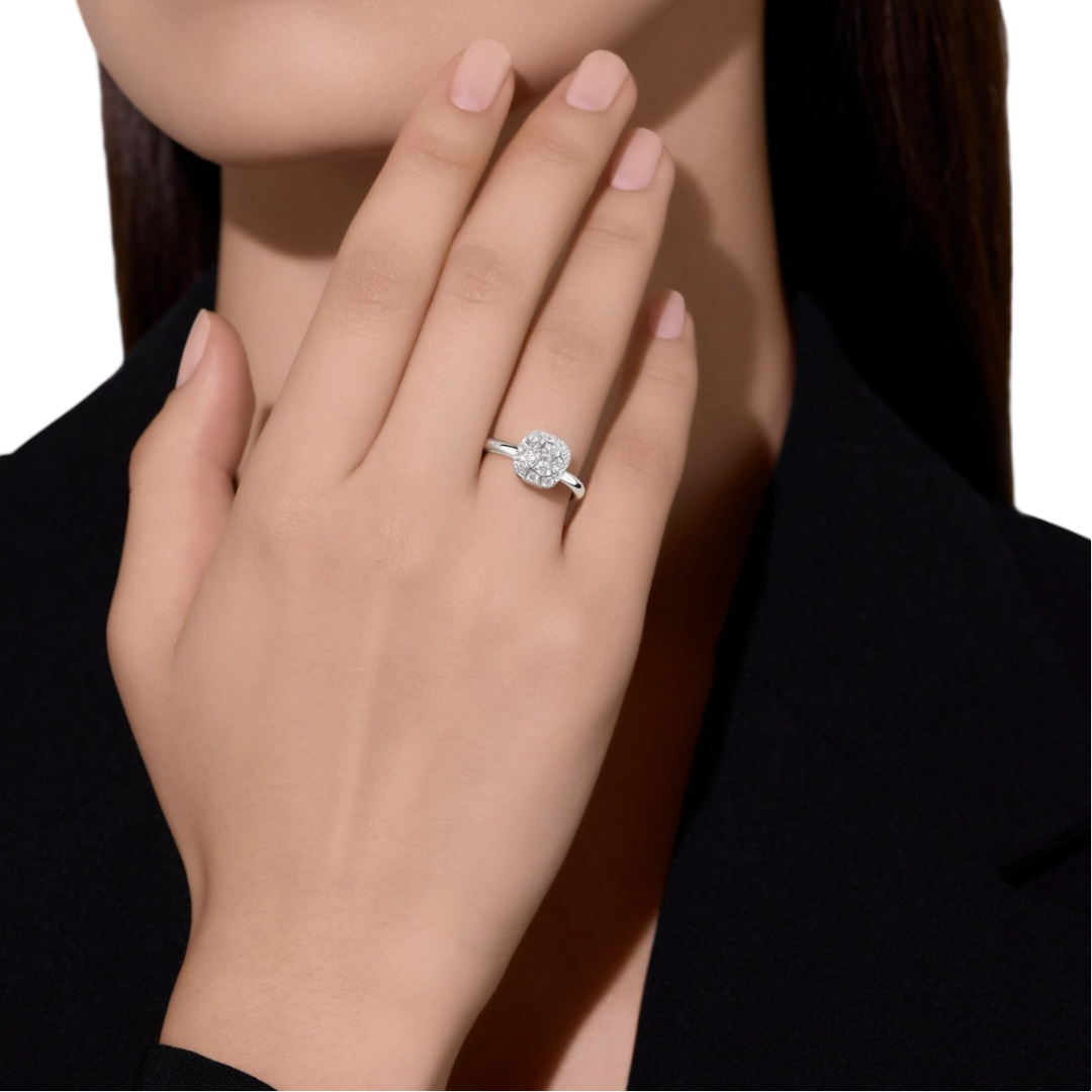 De Nudo-collectie staat bekend om haar minimalistische ontwerp en kleurrijke edelstenen, maar deze specifieke uitvoering onderscheidt zich door de schittering van uitsluitend diamanten, zonder centrale gekleurde steen. Dit maakt de ring bijzonder geschikt voor liefhebbers van een tijdloze en klassieke uitstraling.