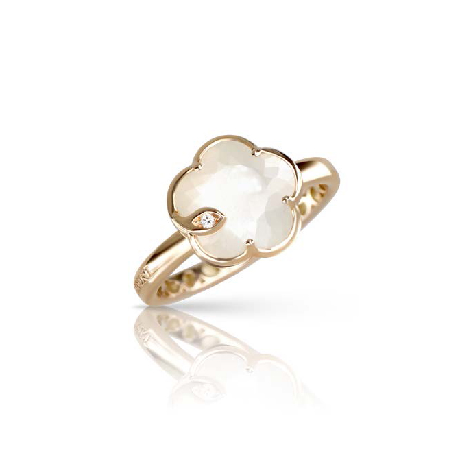 Ton Joli behoudt de delicate facetten van de taglio Bon Ton, een exclusieve door Pasquale Bruni gepatenteerde snit. De collectie herinterpreteert de iconische bloem van het Maison met vijf bloembladen in nieuwe verfijnde proporties. Edelstenen vermengen zich tot een roosgouden bloem, gehuld in een blad van witte en champagnediamanten.