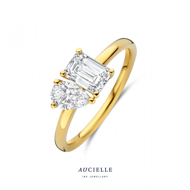 De combinatie van deze twee verschillende vormen geeft de ring een speelse, moderne en exclusieve uitstraling. De pear cut voegt zachtheid en elegantie toe, terwijl de emerald cut bekendstaat om zijn strakke lijnen en chique karakter. Juist dit contrast maakt de AR9028A zo bijzonder en onderscheidend.