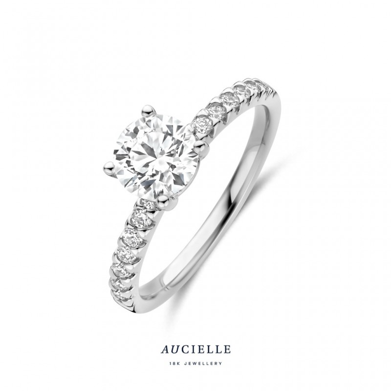 De ring wordt prachtig aangevuld met 0,24 ct aan zijstenen, subtiel langs de band geplaatst voor extra sprankeling en diepte, zonder afbreuk te doen aan de kracht van de solitaire. Vervaardigd in hoogwaardig witgoud, combineert dit ontwerp een moderne uitstraling met klassieke finesse.