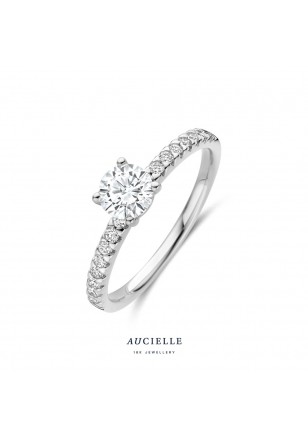 Deze verfijnde Aucielle ring is vervaardigd uit 18 karaat witgoud en straalt tijdloze elegantie uit. Het pronkstuk van de ring is een centrale solitaire diamant van 0.50 karaat, die stevig wordt vastgehouden door vier griffen voor optimale schittering en veiligheid. Daarnaast is de ring afgewerkt met extra zijstenen met een totaalgewicht van 0.19 karaat, die zorgen voor extra fonkeling en luxe.