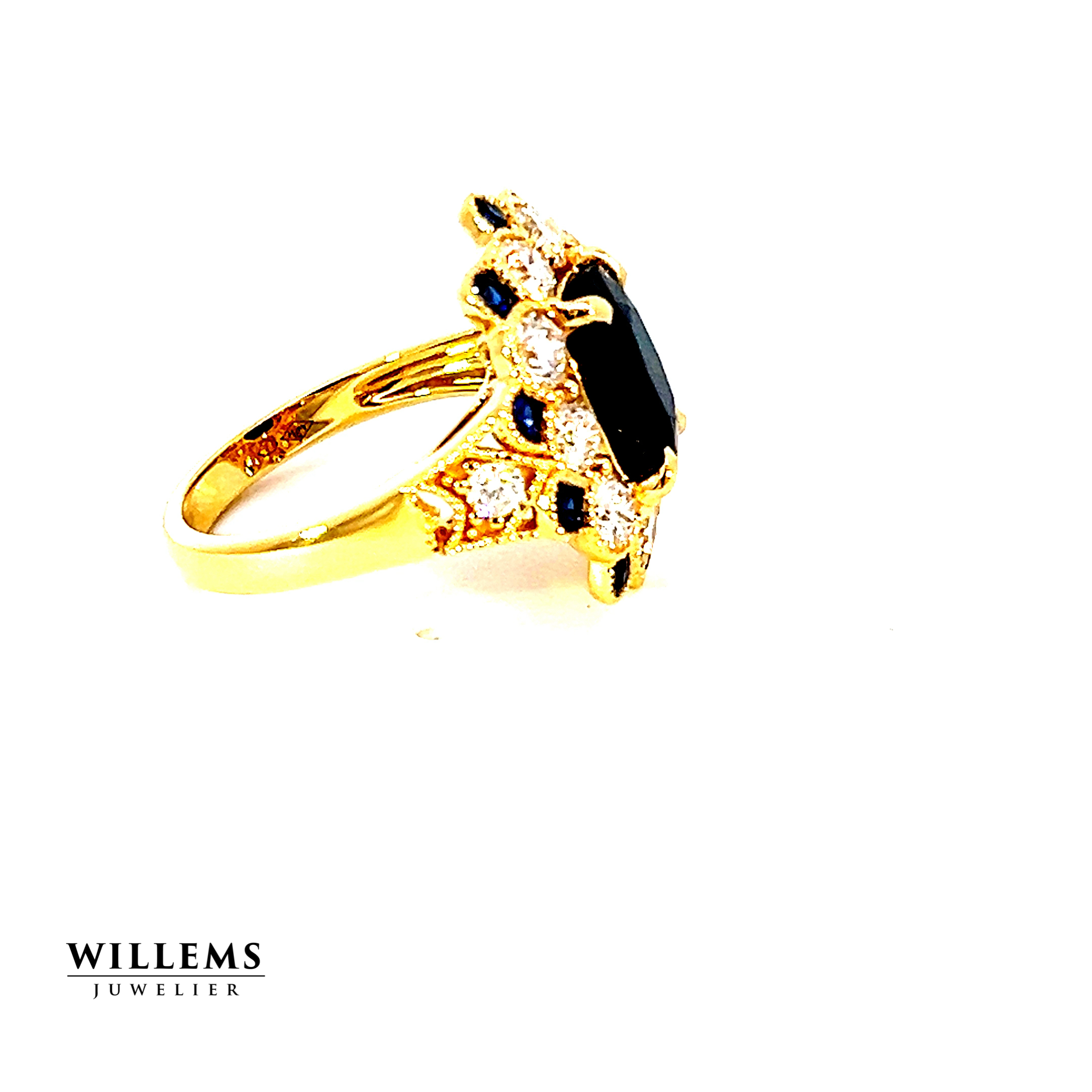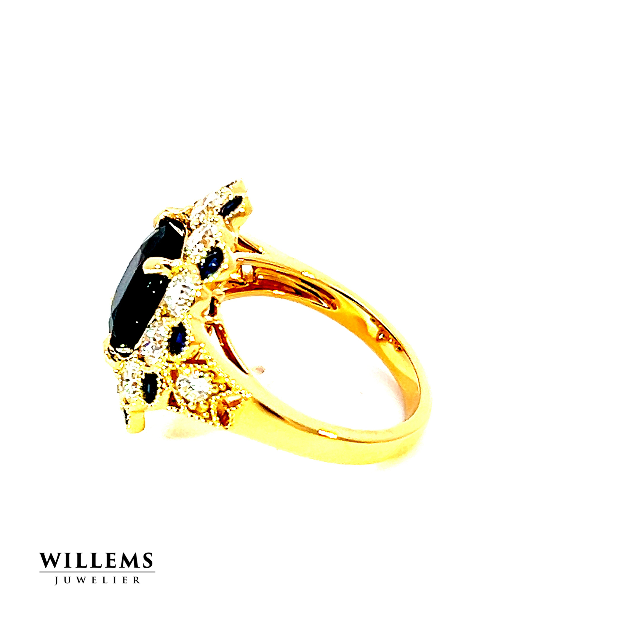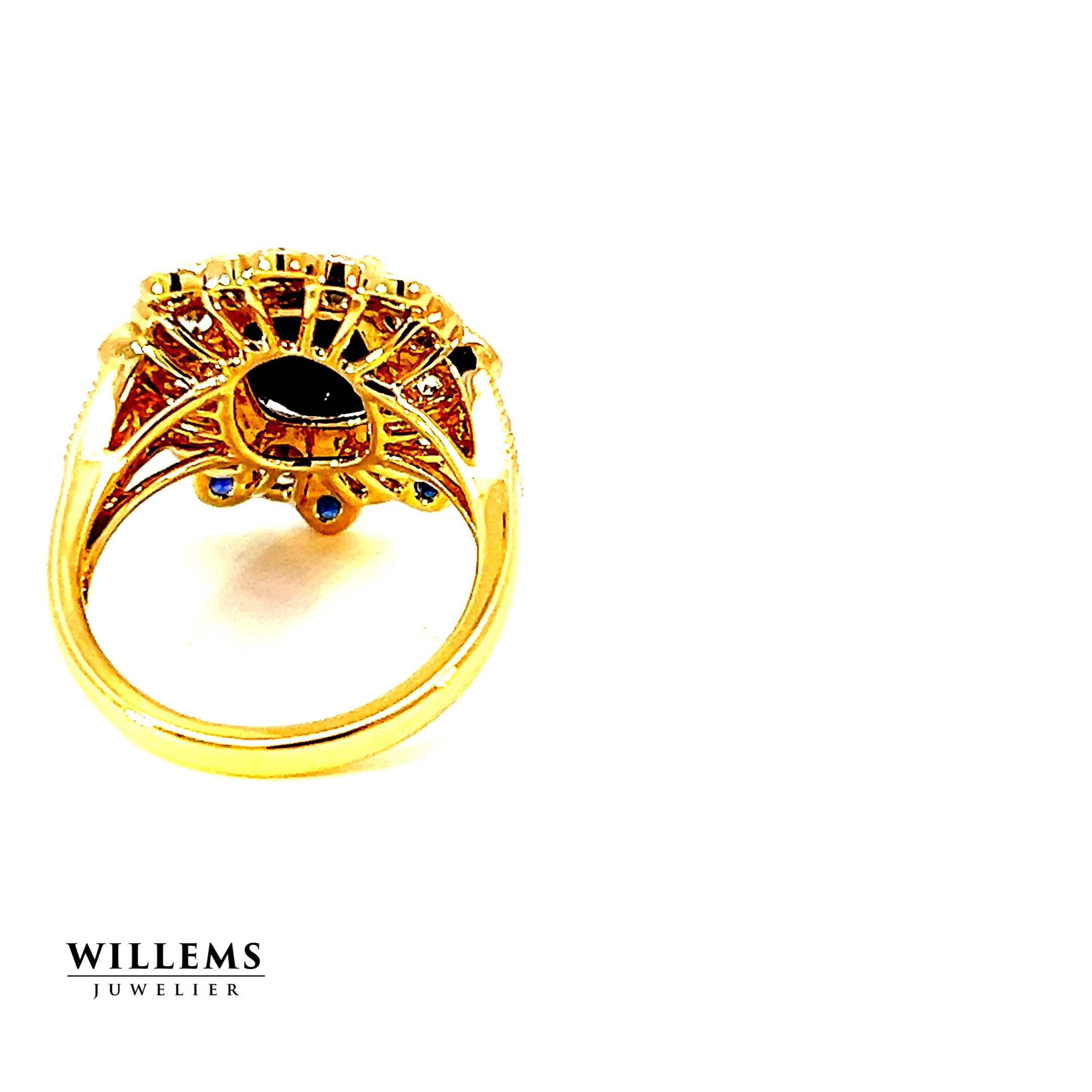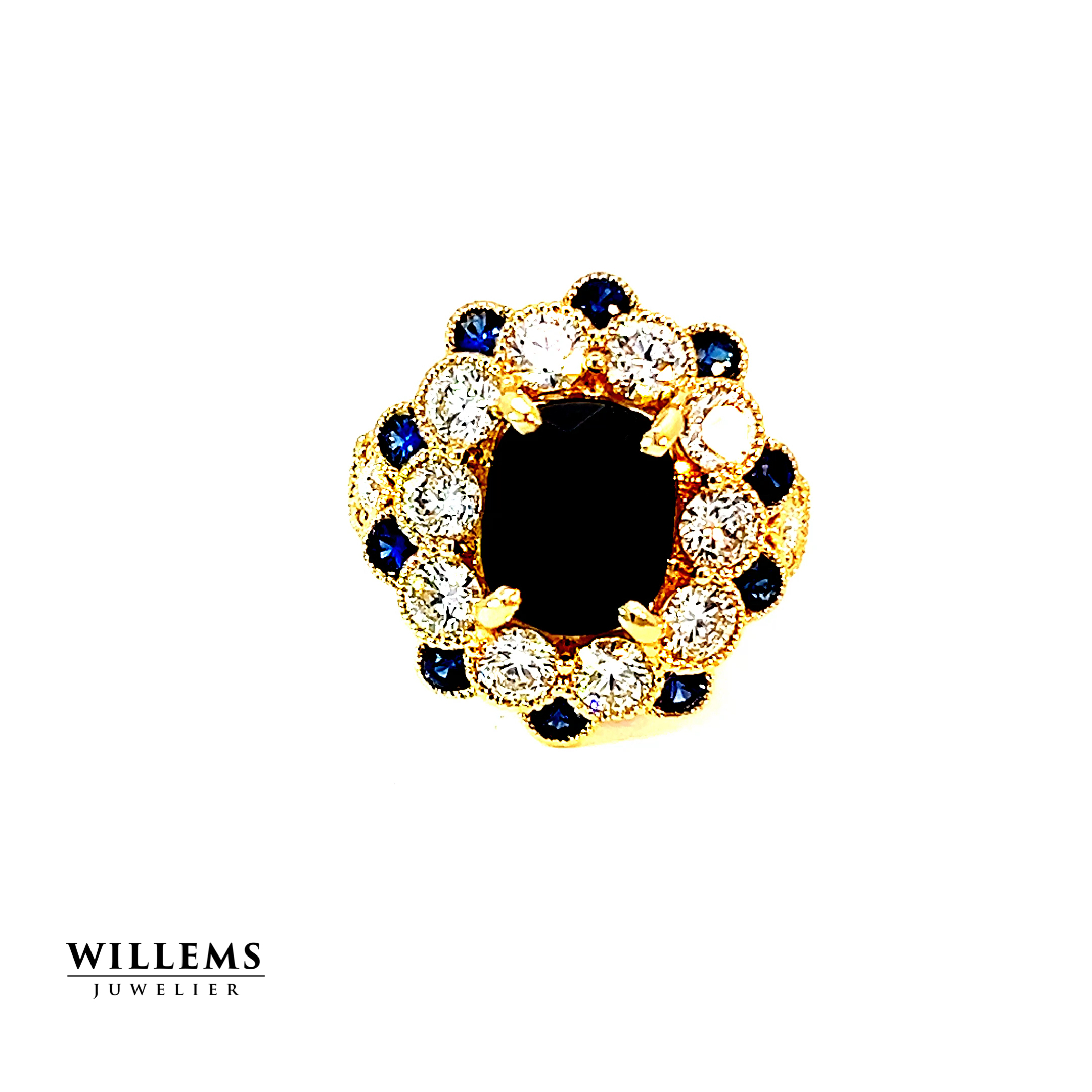 Centraal prijkt een diepblauwe saffier, omarmd door een dubbele halo van briljant geslepen diamanten en kleine, koningsblauwe saffiertjes. De warme gloed van het handgepolijste geelgoud omarmt elke steen, waardoor het geheel een luxueuze en opvallende uitstraling krijgt. Elk detail weerspiegelt het meesterschap van onze goudsmeden en het rijke vakmanschap dat bij Juwelier Willems centraal staat.