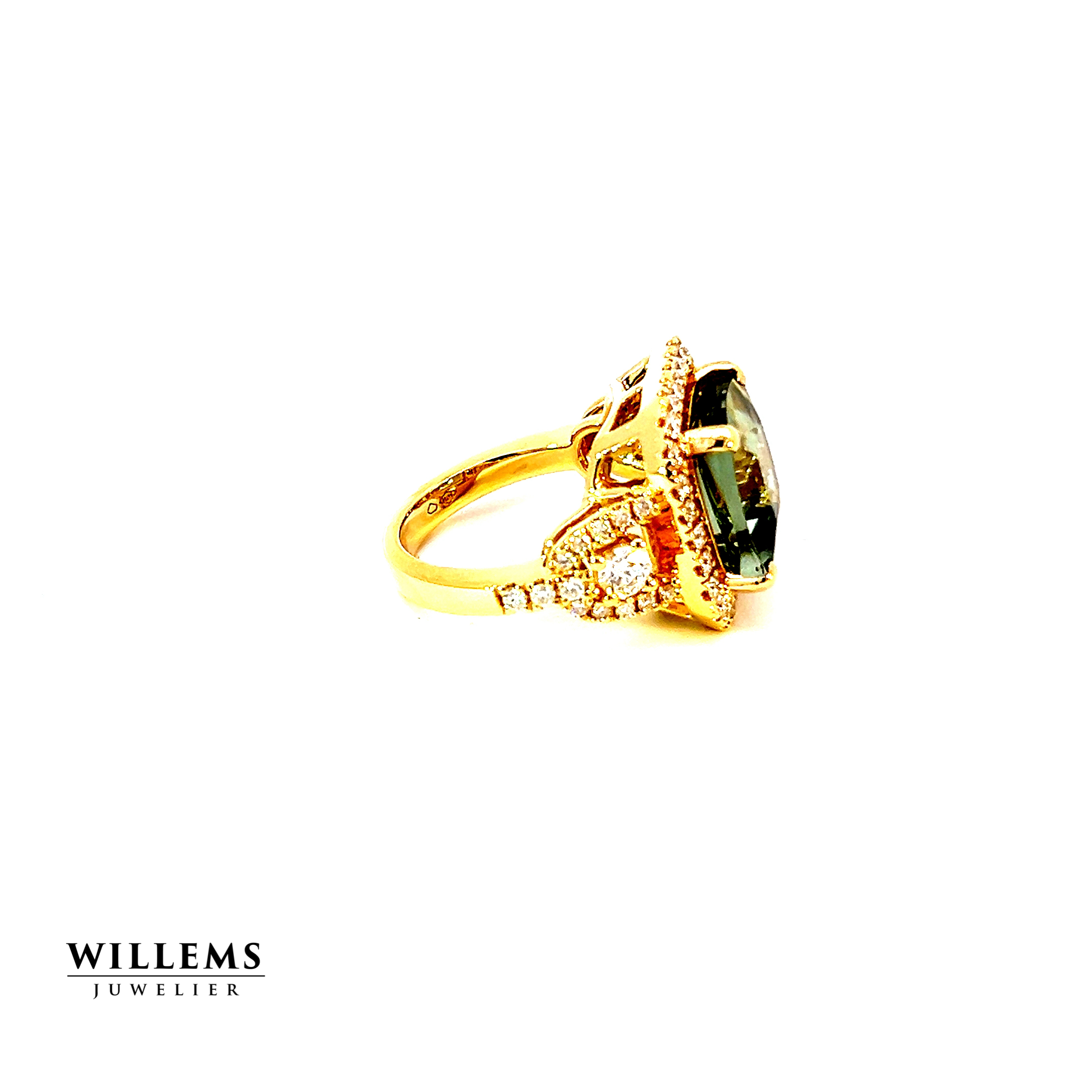 De prasioliet wordt omringd door een dubbele rij fonkelende diamanten, gezet in warm geelgoud, waardoor het geheel een royale en glamourous uitstraling krijgt. Met haar moderne geometrische vorm en artisanale details, is deze ring een perfecte balans tussen eigentijdse stijl en klassieke verfijning.