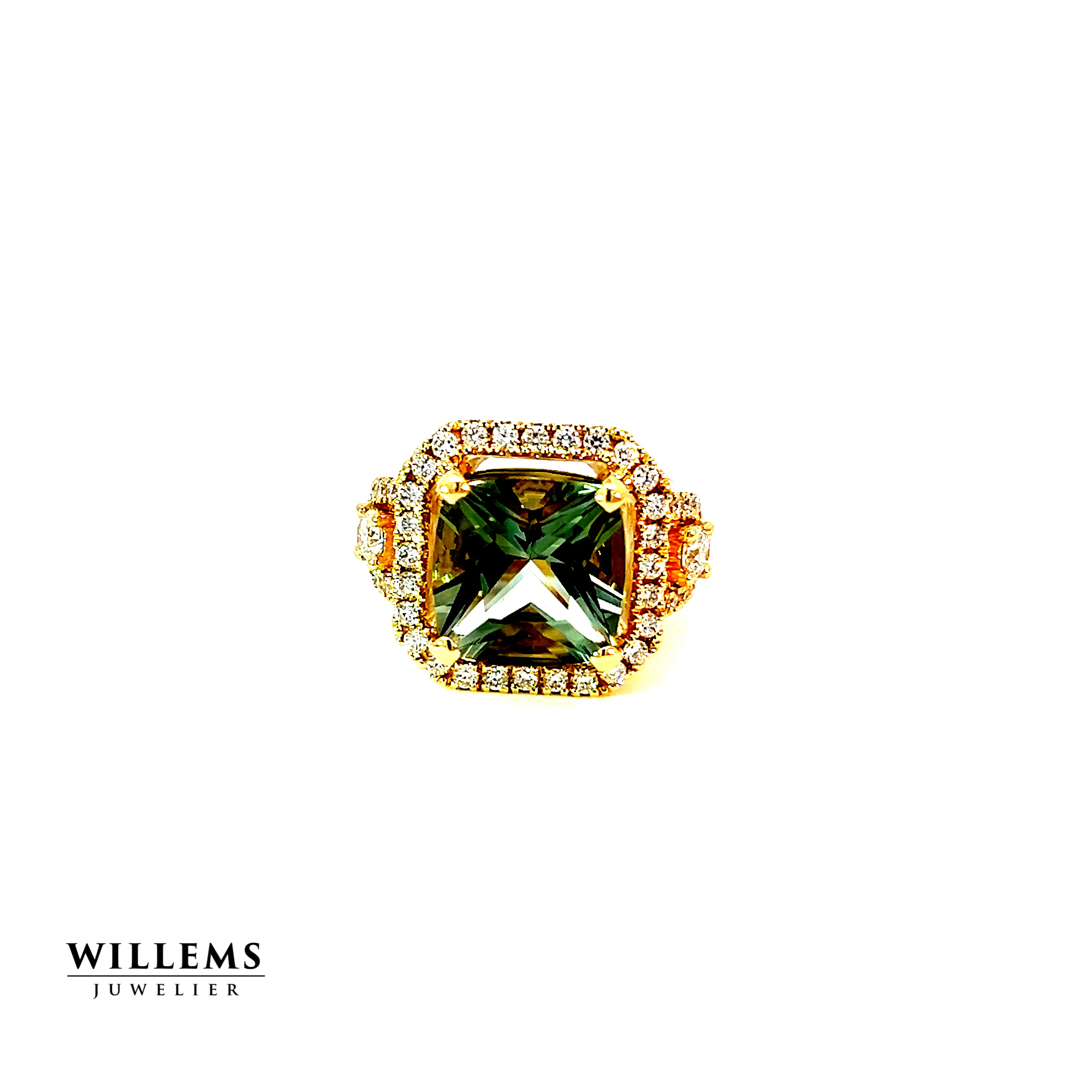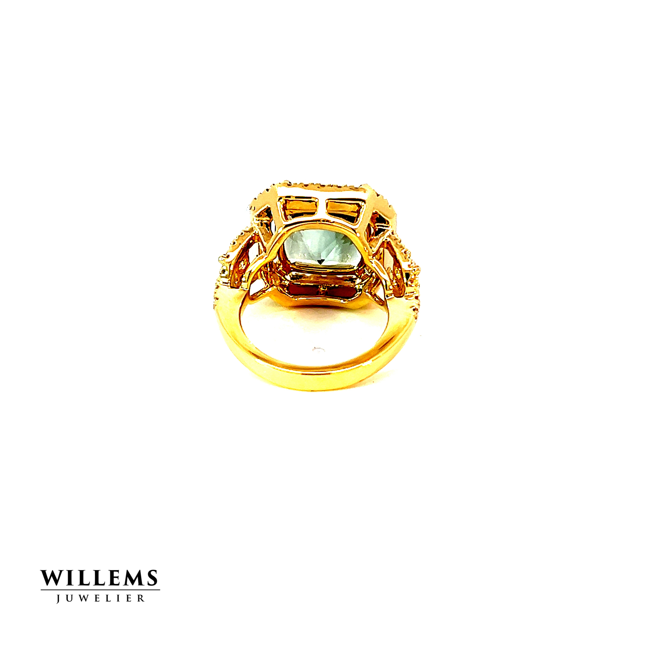 De prasioliet wordt omringd door een dubbele rij fonkelende diamanten, gezet in warm geelgoud, waardoor het geheel een royale en glamourous uitstraling krijgt. Met haar moderne geometrische vorm en artisanale details, is deze ring een perfecte balans tussen eigentijdse stijl en klassieke verfijning.