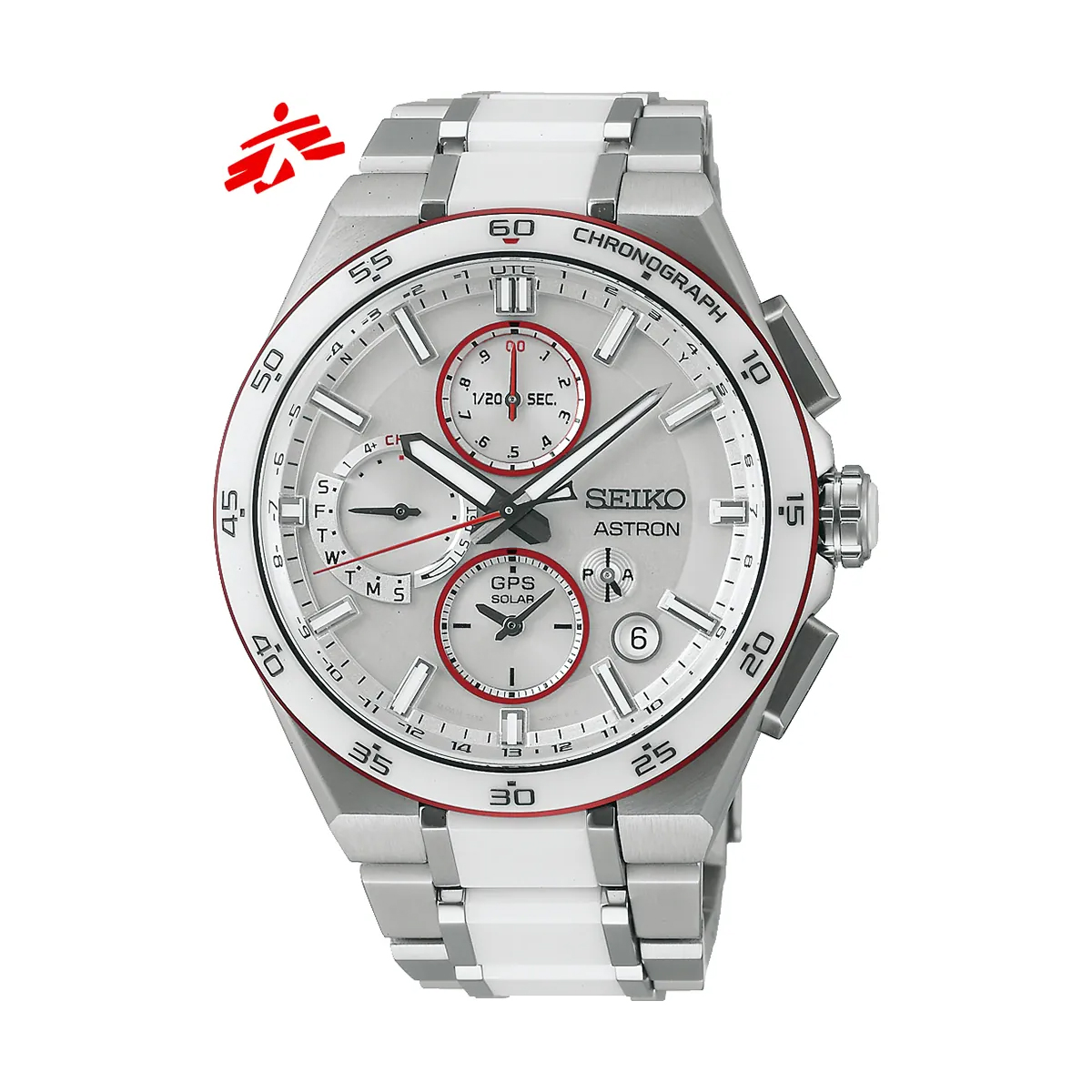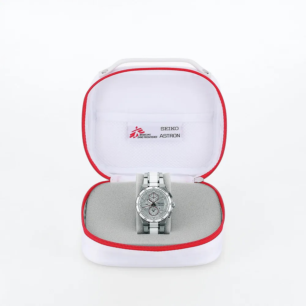 Deze moderne Seiko Astron SSH133J1 GPS Solar Artsen zonder Grenzen Limited Edition springt meteen in het oog door de kenmerkende rode kleur van Artsen zonder Grenzen en de stijlvolle witzilveren wijzerplaat. Deze Seiko in een gelimiteerde oplage van 800 stuks is speciaal ontworpen in samenwerking met Artsen zonder Grenzen, die mensen in crisissituatie toegang biedt tot medische hulp. Dit horloge heeft serienummer 208/800. De titanium horlogeband is voorzien van een vouwsluiting met drukker. Het horloge heeft een diameter van 43 mm . Verder is het horloge tot 100 meter waterdicht. Ook de kast is gemaakt van titanium. Dit materiaal is zeer sterk, licht in gewicht en krasbestendig. De zilverkleurige wijzerplaat is voorzien van lichtgevende wijzers en index. Het horloge heeft een 5X53 GPS-kaliber. Dit kaliber is snel, makkelijk te bedienen en heeft een zeer goede ontvangst. Met een druk op de knop kan over ter wereld de juiste lokale tijd worden ingesteld. Het horloge is extreem accuraat. Daarnaast wordt de zomertijd ook automatisch ingesteld en er kan een tweede tijd worden ingesteld. Deze wordt weergegeven in het 12h venster met een aparte AM/PM indicator. Het horloge werkt op lichtenergie, die wordt gegenereerd door de Solar wijzerplaat. Een deel van de opbrengst van elke aankoop wordt gedoneerd aan Artsen zonder Grenzen.