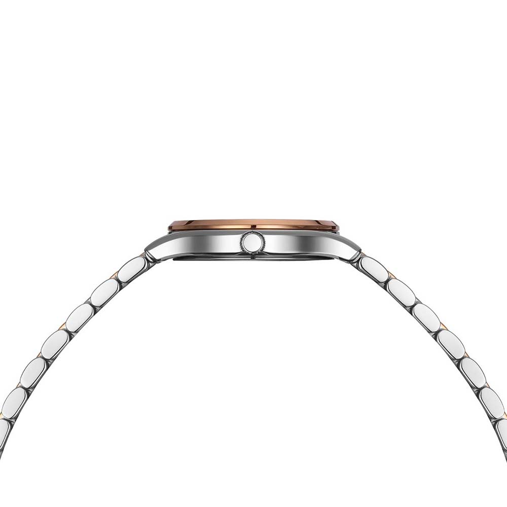 Dit elegante Beleganza dameshorloge beschikt over een kleurgecoate roestvrijstalen kast van 28 mm, gecombineerd met een stijlvolle tweekleurige metalen band. De rijke, bruine wijzerplaat is prachtig versierd met fonkelende briljanten en voorzien van een datumaanduiding, wat het horloge een luxueuze en verfijnde uitstraling geeft.