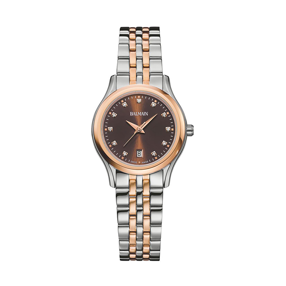 Dit elegante Beleganza dameshorloge beschikt over een kleurgecoate roestvrijstalen kast van 32 mm, gecombineerd met een stijlvolle tweekleurige metalen band. De rijke, bruine wijzerplaat is prachtig versierd met fonkelende briljanten en voorzien van een datumaanduiding, wat het horloge een luxueuze en verfijnde uitstraling geeft.