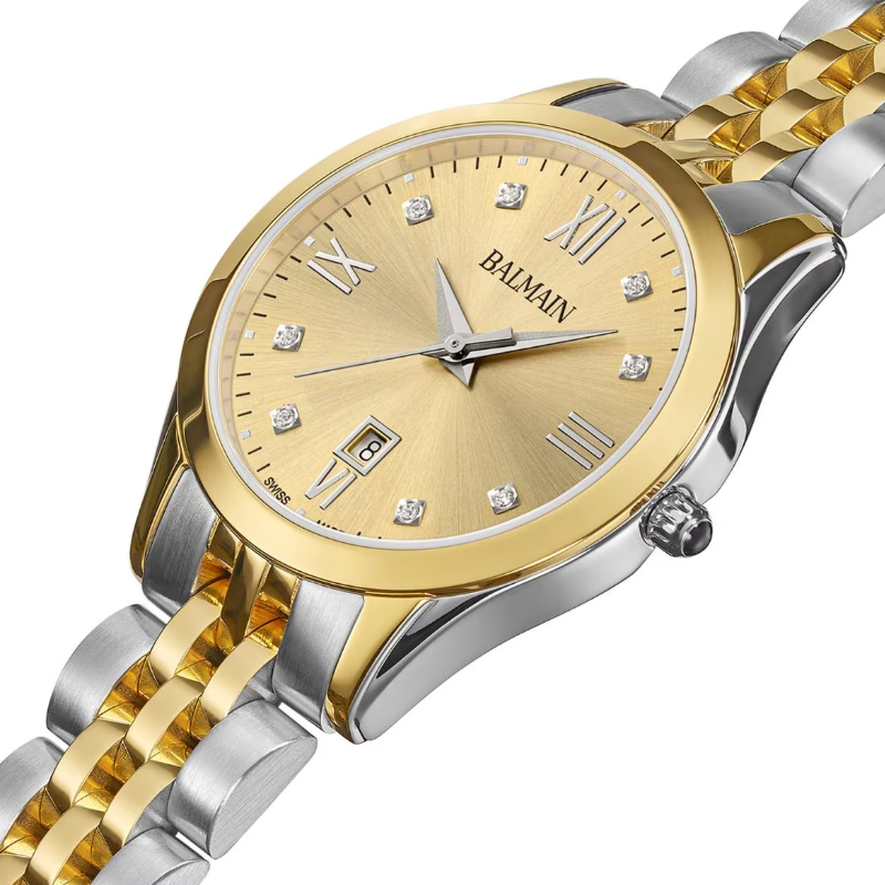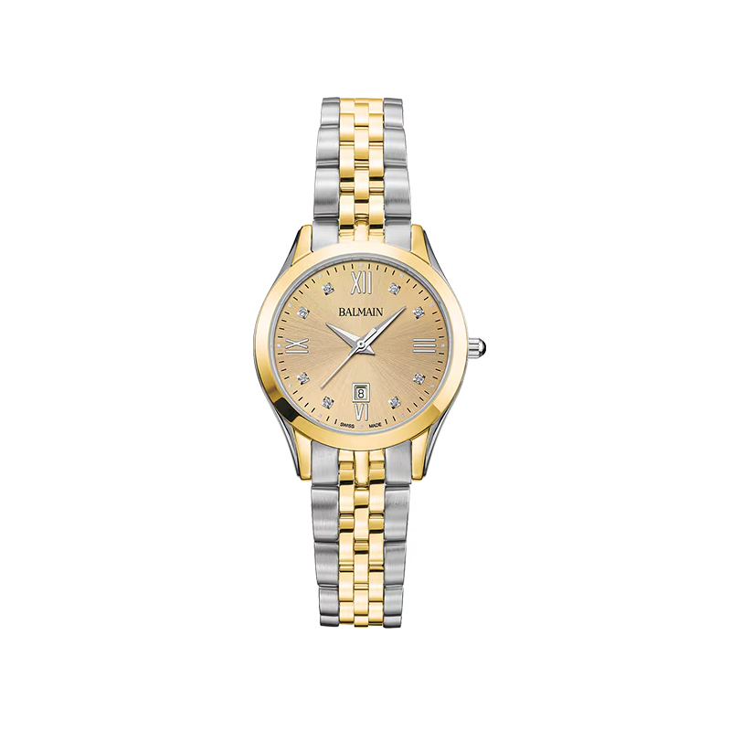 Dit elegante Classic R dameshorloge beschikt over een kleurgecoate roestvrijstalen bicolor kast van 30 mm, gecombineerd met een stijlvolle tweekleurige metalen band. De rijke, goudkleurige wijzerplaat is prachtig versierd met fonkelende briljanten en voorzien van een datumaanduiding, wat het horloge een luxueuze en verfijnde uitstraling geeft.