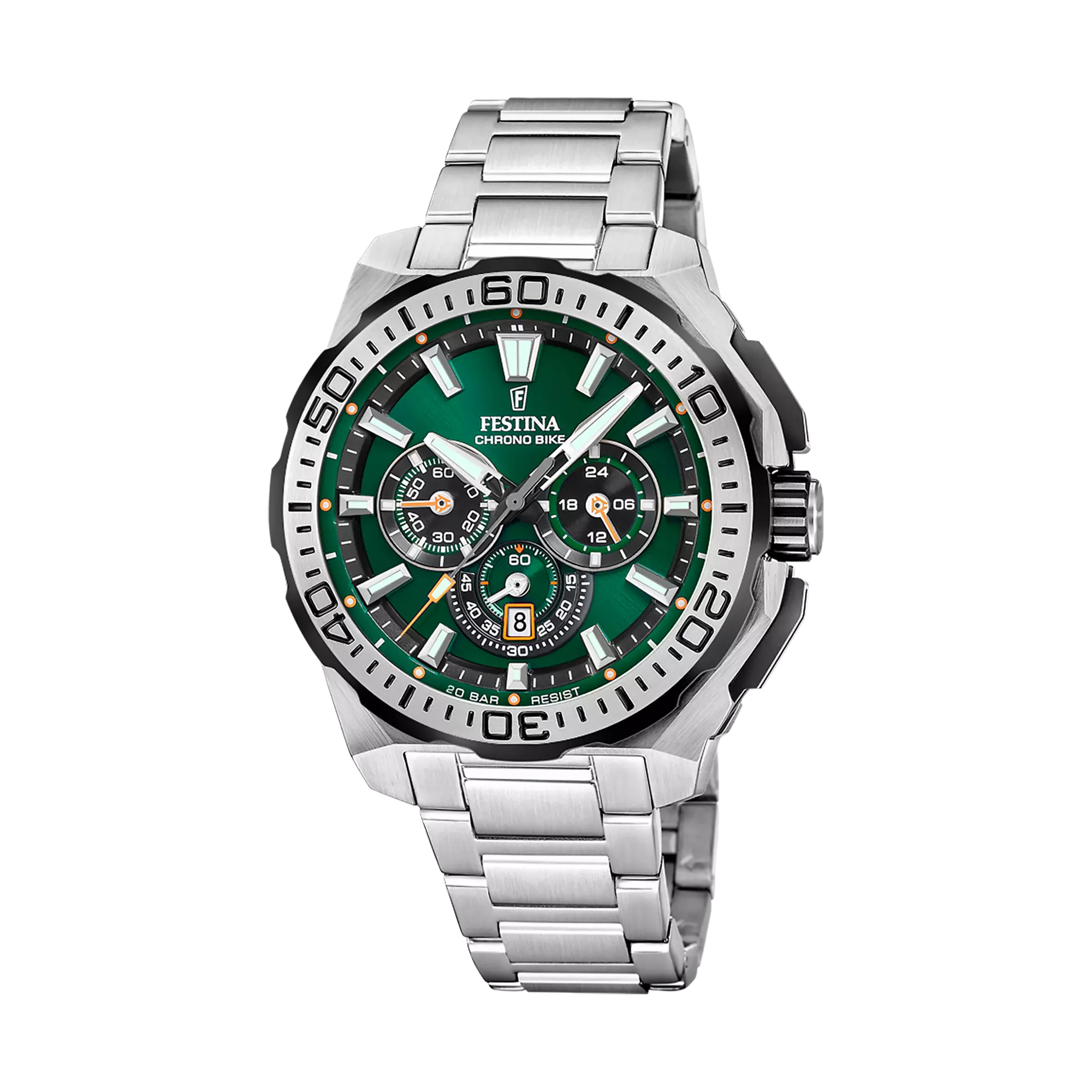 De Festina Chrono Bike 2025 is een chronograaf ontworpen voor sportliefhebbers en precisie. De 45,5 mm roestvrijstalen kast van 316L garandeert weerstand tegen schokken, krassen en corrosie, terwijl het MOS20 kwartsuurwerk een nauwkeurige en betrouwbare tijdmeting biedt. De wijzerplaat, in levendige kleuren en met lichtgevende indexen en wijzers, zorgt voor optimale leesbaarheid, zelfs bij weinig licht. Bovendien bevat het drie functionele subdials en een datumaanduiding op zes uur.