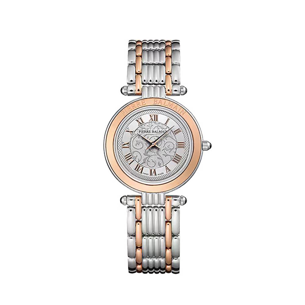 Dit verfijnde Haute Elegance dameshorloge heeft een bicolor roestvrijstalen kast van 30 mm en is voorzien van een stijlvolle bicolor metalen band. De zilverkleurige wijzerplaat, afgedekt met saffierglas, biedt een perfecte combinatie van tijdloze elegantie en duurzaamheid.