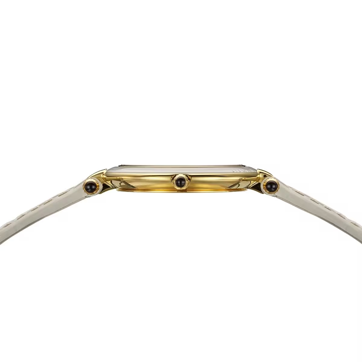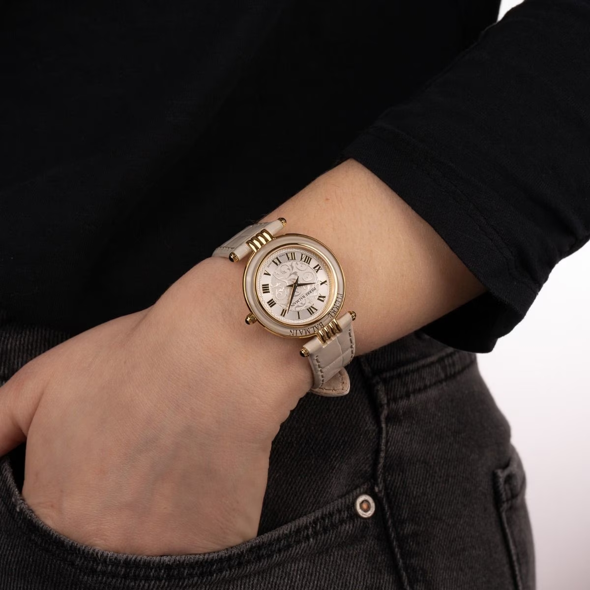 Dit horloge combineert een slanke silhouette met verfijnde details zoals de arabesken en Romeinse cijfers—ideaal voor wie houdt van subtiel, maar toch opvallend stijldesign. De beige lederen band en de gouden accenten maken het een perfecte match voor elegante, dagelijkse outfits of formelere gelegenheden.
