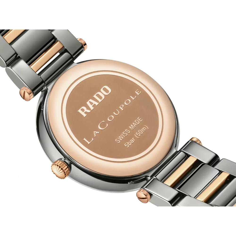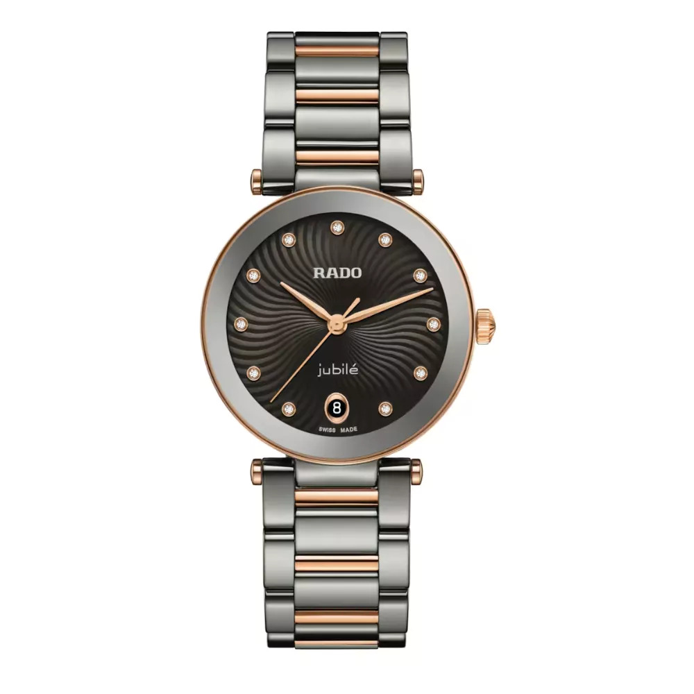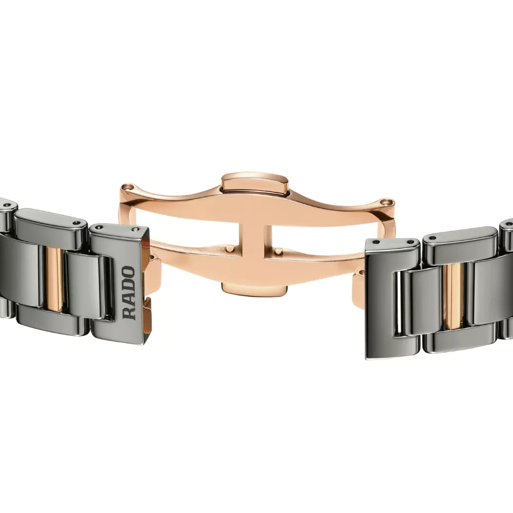 LaCoupole staat symbool voor de iconen van gisteren, opnieuw gedefinieerd voor de verfijnde drager van vandaag. Een uiting van verfijnde glamour, ontworpen met de precisie en innovatie die alleen Rado kan bieden. De 31 mm monobloc kast van gepolijst plasma hightech keramiek is bekroond met een gewelfd saffierglas, veredeld door een grijs- en roségoudkleurige gemetalliseerde rand. De kast is waterbestendig tot 5 bar (50 meter), waardoor dagelijkse veerkracht wordt gecombineerd met blijvende elegantie. Het resultaat is een silhouet dat onmiskenbaar Rado is: strak, sculpturaal en tijdloos. De grijze wijzerplaat is voorzien van golfvormige markeringen gevuld met lak, wat een weelderig driedimensionaal effect creëert. 11 Top Wesselton full-cut diamanten fungeren als uurmarkeringen en geven de wijzerplaat een stille schittering, terwijl een datumvenster op 6 uur verfijnde functionaliteit biedt. Het hart van het horloge is het 8-juweel quartz kaliber R218, veredeld door PreciDrive™-technologie voor uitzonderlijke precisie. De kast wordt vastgezet door de band van gepolijst plasma hightech keramiek, verrijkt met elementen en sluiting met roségouden PVD-coating, die het ontwerp in een naadloze harmonie completeert. De LaCoupole is een symbool van gratie: ontworpen om begeerlijk te zijn en vervaardigd om lang mee te gaan.