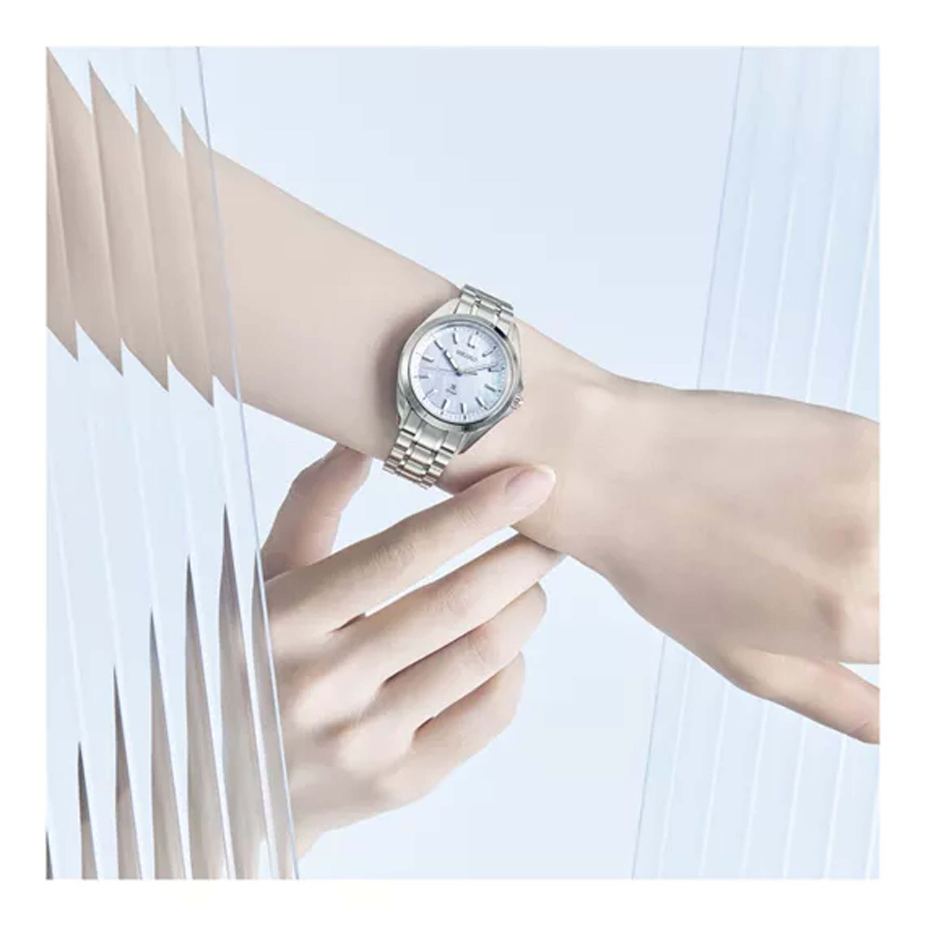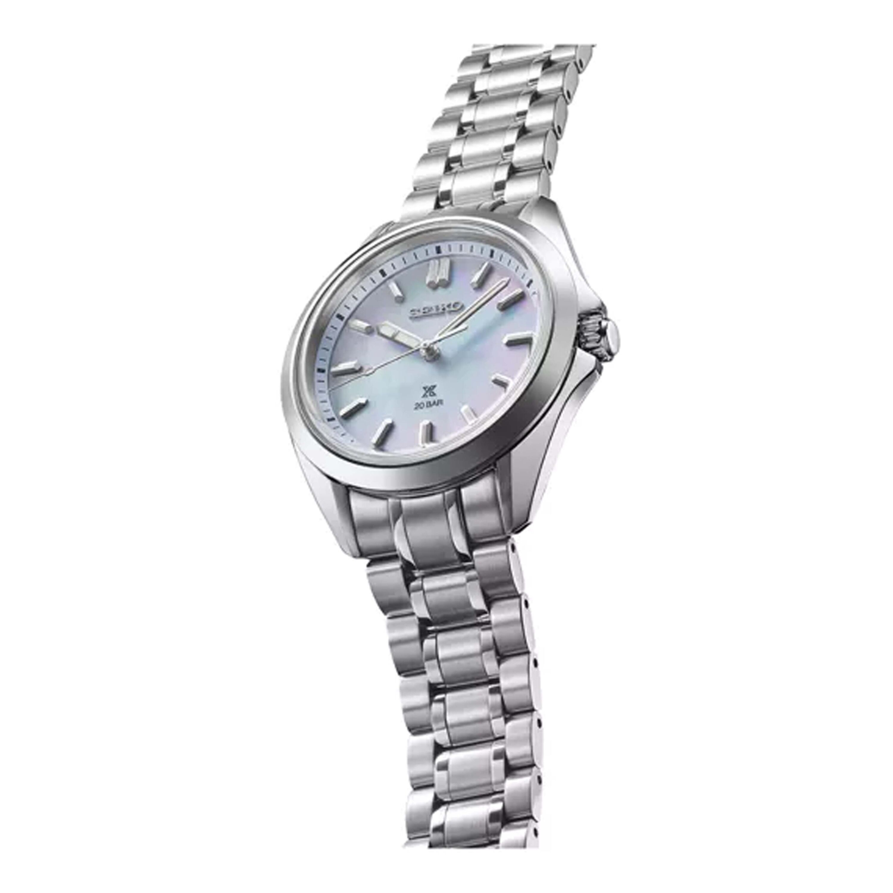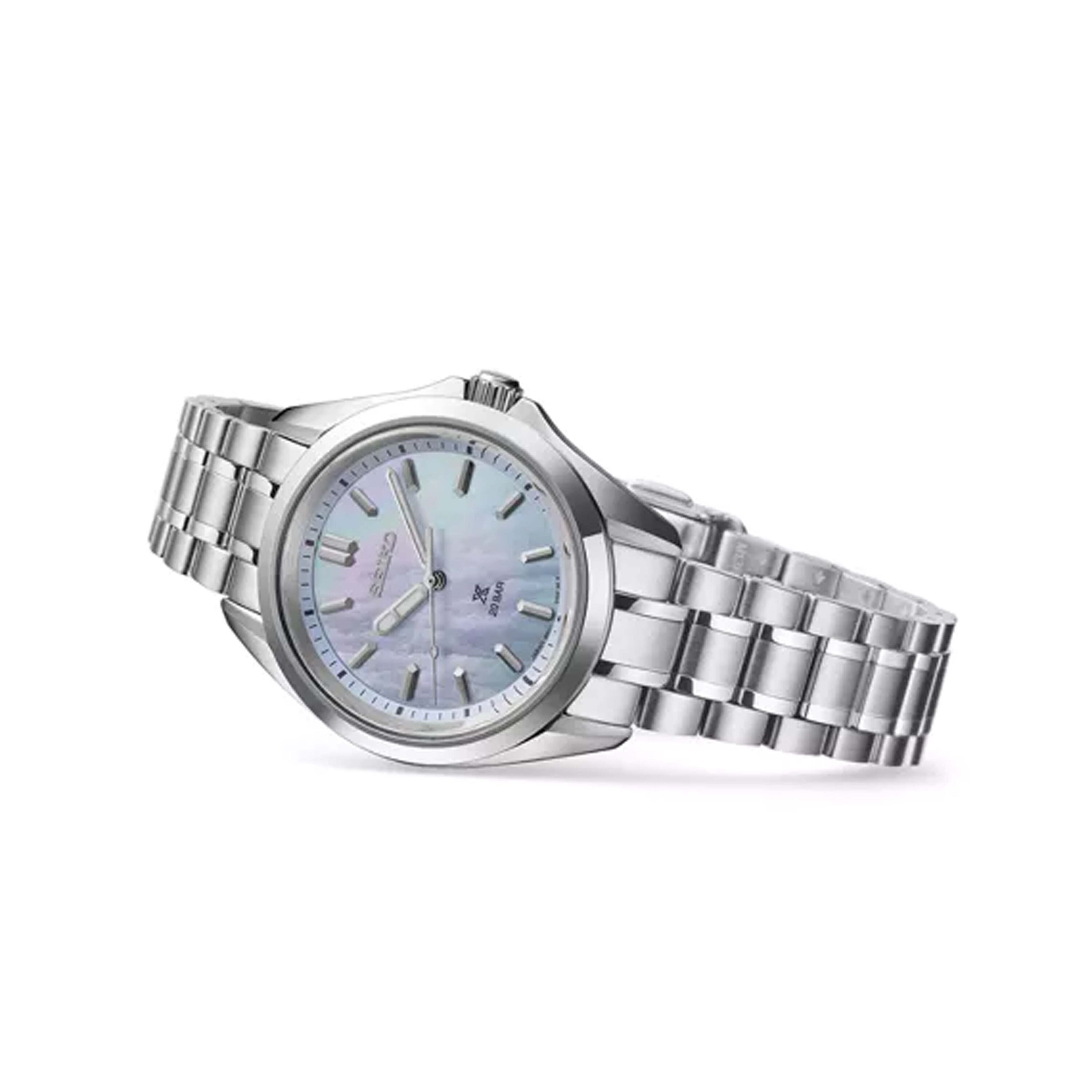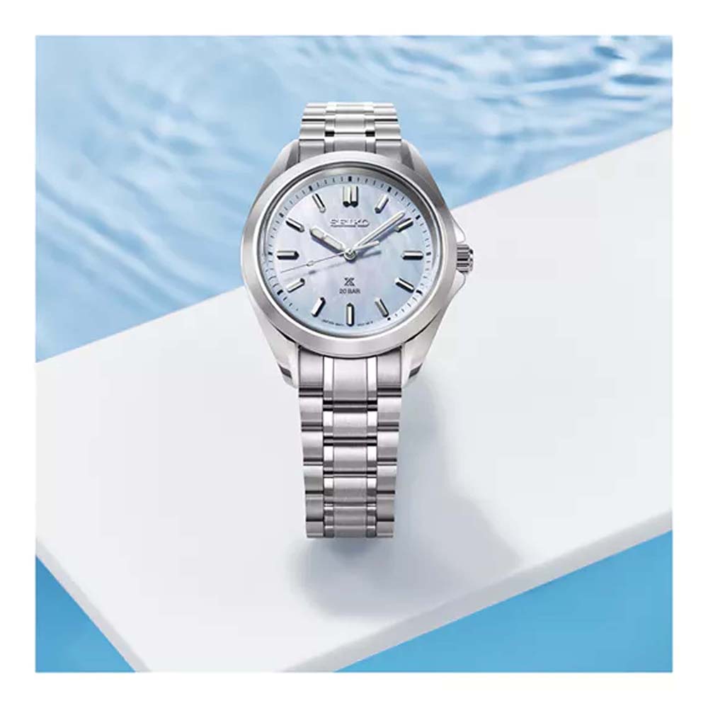 De lichtblauwe wijzerplaat is vervaardigd van parelmoer, een materiaal dat een elegantie uitstraalt die perfect past bij feestelijke gelegenheden. Tegelijkertijd verbeteren de vorm van de wijzers en het gebruik van Lumibrite de leesbaarheid in elke omgeving, zoals verwacht van een modern sporthorloge. Een hoogwaardige armband zorgt voor uitstekend comfort dankzij kortere schakels die het mogelijk maken om zich aan te passen aan polsen van alle formaten.