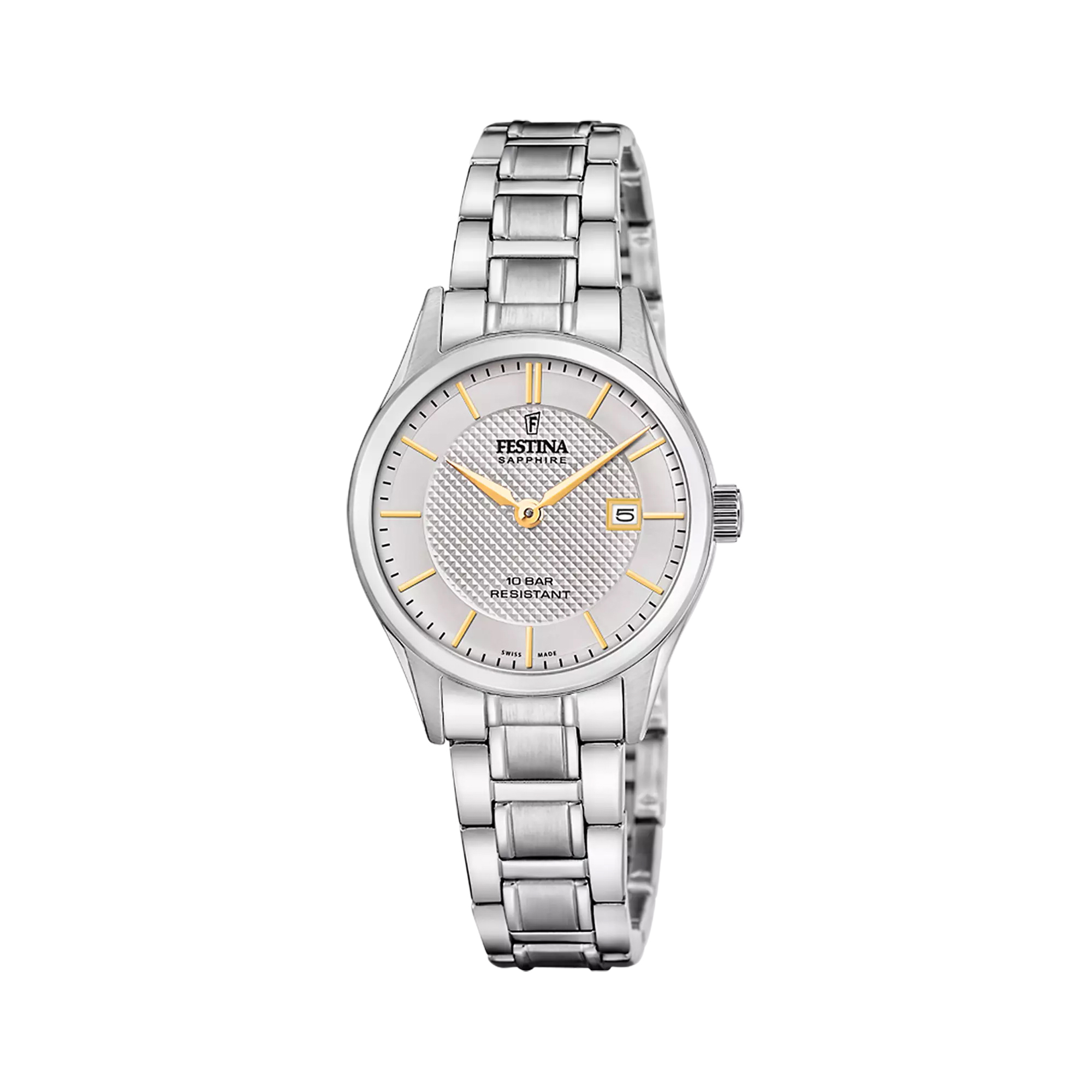 Dit verfijnde Festina Swiss Made dames horloge is een toonbeeld van klassieke elegantie. Uitgevoerd in een tijdloos design en voorzien van krasbestendig saffierglas, combineert dit horloge duurzaamheid met een subtiele, stijlvolle uitstraling. Festina's vakmanschap en Zwitserse precisie maken dit horloge een betrouwbare keuze voor elke gelegenheid, terwijl het saffierglas zorgt voor een langdurige helderheid en bescherming. Een perfect uurwerk voor de vrouw die klassieke schoonheid waardeert.