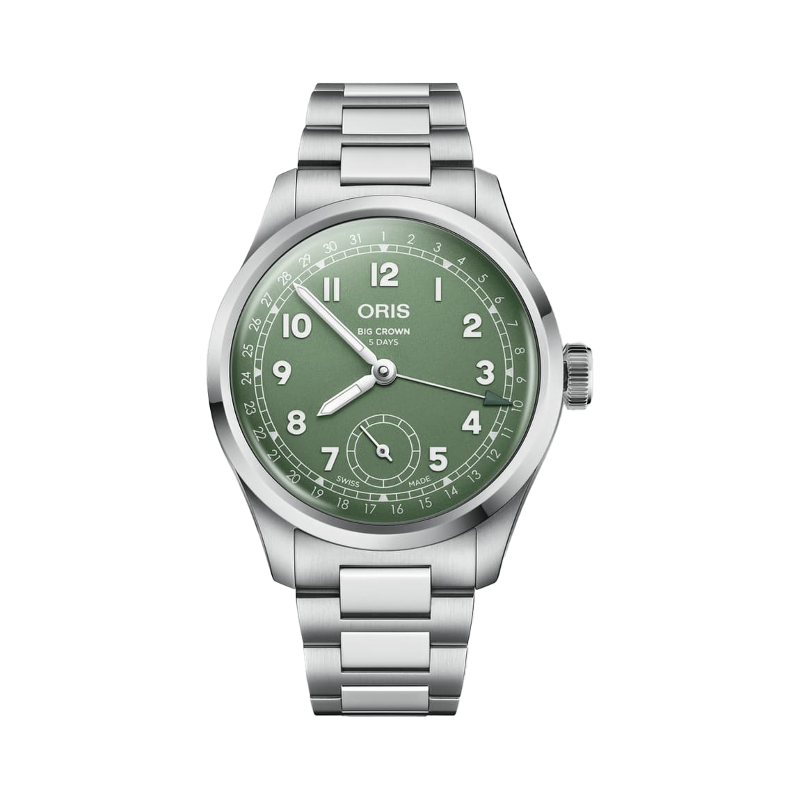 De Oris Big Crown Pointer Date met groene wijzerplaat is een iconisch horloge dat elegantie en traditie perfect combineert. Dit model valt op door zijn karakteristieke oversized kroon en het unieke wijzersysteem, waarbij een centrale wijzer de datum aanduidt op de buitenste schaal van de wijzerplaat. De groene wijzerplaat geeft het horloge een moderne en frisse uitstraling, terwijl de kast van roestvrij staal en het gewelfde saffierglas zorgen voor duurzaamheid en tijdloze klasse. Aangedreven door het Oris Calibre 403, een in-house automatisch uurwerk, biedt deze Big Crown niet alleen precisie maar ook betrouwbaarheid. Dankzij het elegante ontwerp en hoogwaardige afwerking is dit horloge een uitstekende keuze voor liefhebbers van Zwitserse horlogemakerstraditie met een eigentijdse twist.