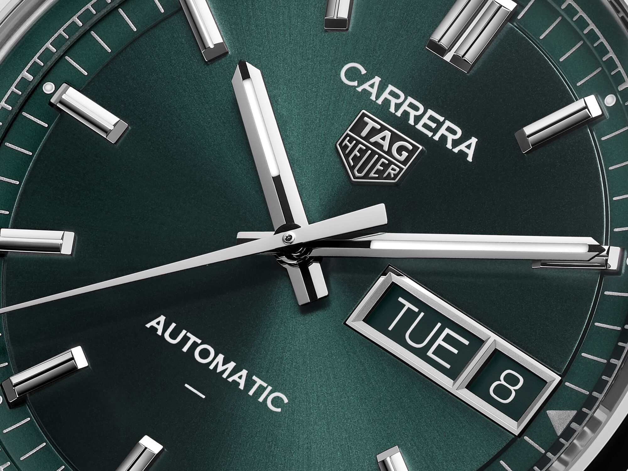 De groene wijzerplaat is een opvallend middelpunt, geaccentueerd door rhodiumgeplateerde wijzers en indexen, terwijl de zwarte rand diepte toevoegt en het geheel versterkt. De kastachterkant is trots gegraveerd met een Overwinningskrans, een symbool van het succesverhaal van de TAG Heuer Carrera-collectie.