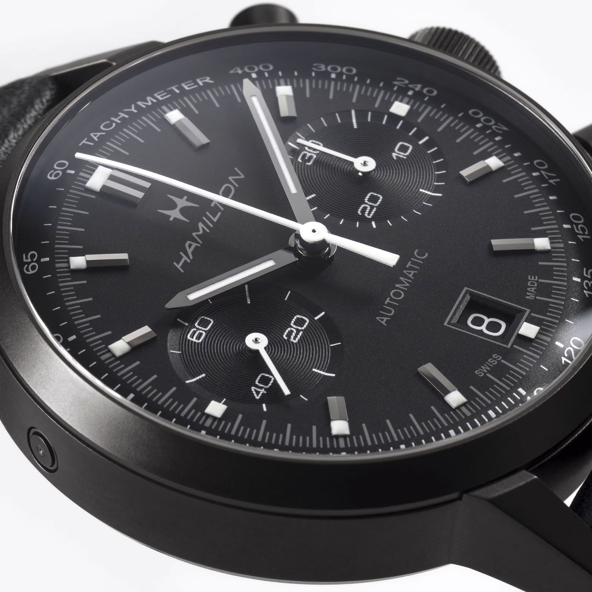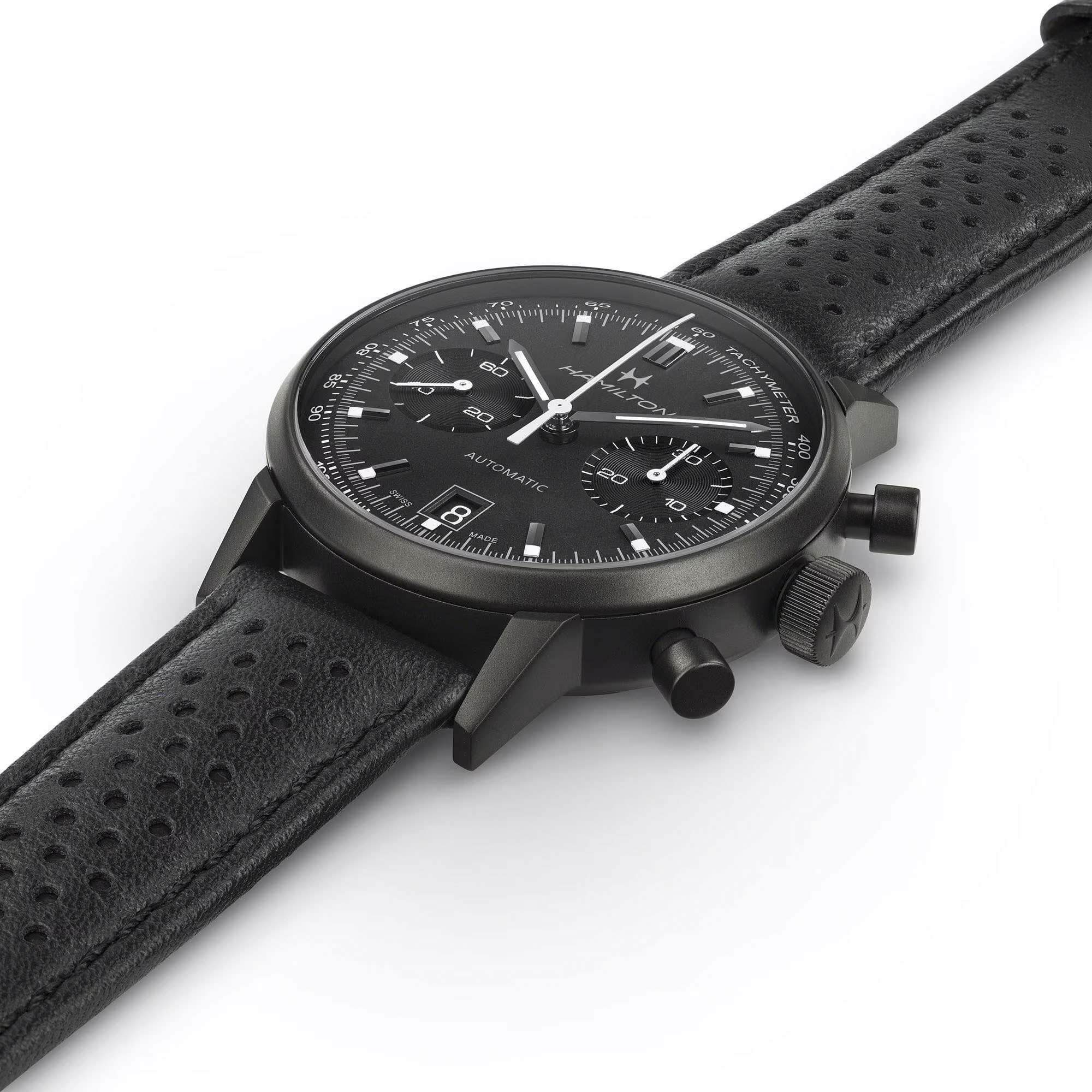 De Hamilton American Classic Intra-Matic Auto Chrono (referentie H38446730) combineert vintage charme met moderne prestaties. Geïnspireerd door het originele racedesign uit 1968, biedt dit horloge een eigentijdse interpretatie van een klassiek model. De volledig zwarte 40 mm PVD-kast, wijzerplaat en geperforeerde lederen band geven een moderne uitstraling aan dit historische ontwerp dat teruggrijpt naar de jaren '70
