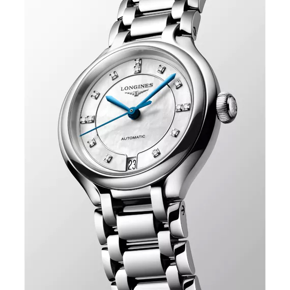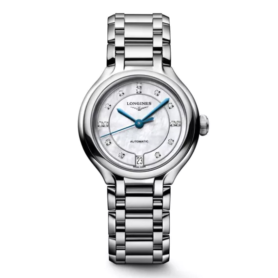 De Primaluna Automatic 34mm valt direct op door de ronde, zacht gevormde kast van edelstaal (soms gecombineerd met roségoud of diamanten details). De diameter van 34mm zorgt voor een perfecte balans tussen subtiliteit en aanwezigheid om de pols. De zilverkleurige of parelmoeren wijzerplaat, vaak versierd met Romeinse cijfers of fonkelende diamanten indexen, benadrukt het elegante karakter van het horloge. Het saffierglas is krasbestendig en heeft een anti-reflectiecoating voor optimale leesbaarheid.