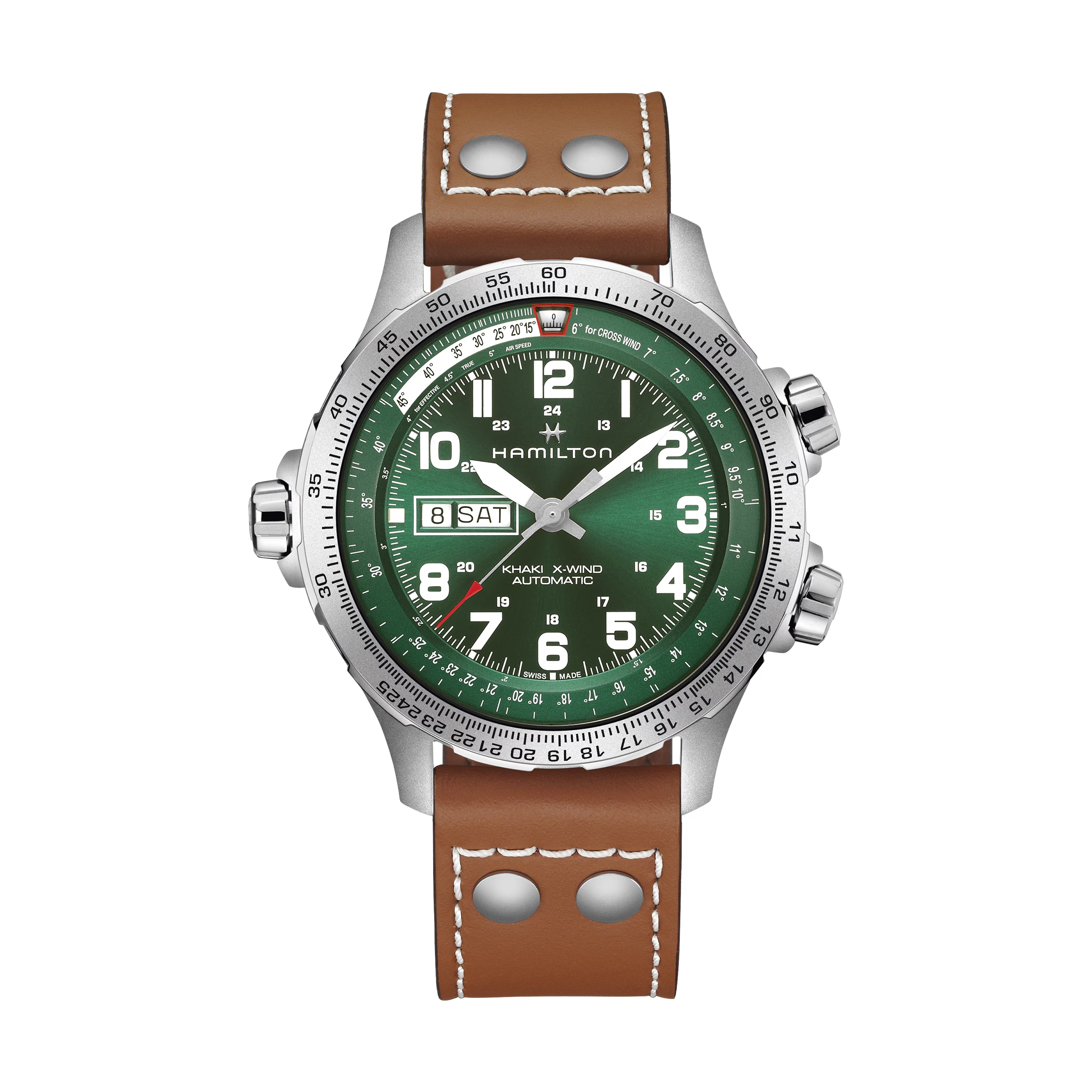 Hamilton heeft de Khaki X-Wind collectie uitgebreid met een automatisch model voorzien van een dag- en datumfunctie. Uitgerust met grote SuperLumiNova®-cijfers en sportieve wijzers voor optimale leesbaarheid, zelfs als u slechts een fractie van een seconde heeft om naar de wijzerplaat te kijken. De dag- en datumweergave op de 9-uurspositie houdt het display perfect in balans, helder en volledig klaar voor 'take-off'.